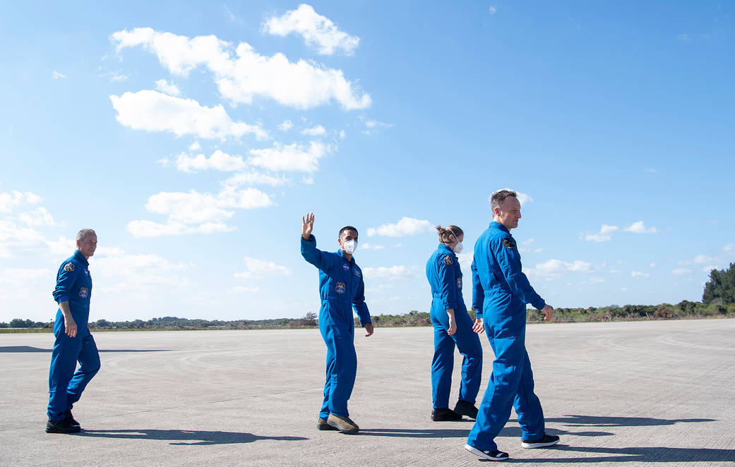 nhq202110260016 (Oct. 26, 2021) — NASA astronauts Tom Marshburn, left, Raja Chari, second from left, Kayla Barron, second from right, and ESA (European Space Agency) astronaut Matthias Maurer, right, are seen as they depart the Landing Facility at NASA’s Kennedy Space Center ahead of SpaceX’s Crew-3 mission, Tuesday, Oct. 26, 2021, in Florida. NASA’s SpaceX Crew-3 mission is the third crew rotation mission of the SpaceX Crew Dragon spacecraft and Falcon 9 rocket to the International Space Station as part of the agency’s Commercial Crew Program. Chari, Marshburn, Barron, Maurer are scheduled to launch at Oct. 31 at 2:21 a.m. ET, from Launch Complex 39A at the Kennedy Space Center. Photo Credit: NASA/Joel Kowsky