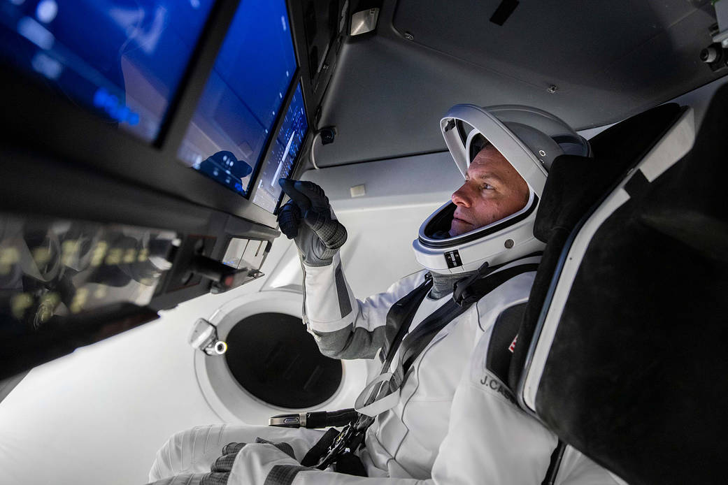 jsc2022e068646 (Aug. 17, 2022) — SpaceX Crew-5 Pilot Josh Cassada of NASA is pictured during a Crew Dragon cockpit training session at SpaceX headquarters in Hawthorne, California. Credit: SpaceX