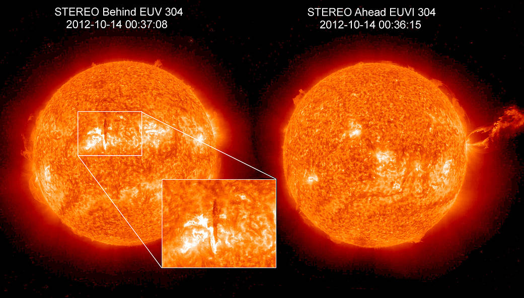 Each of these images was captured from a different perspective by each of NASA's Solar Terrestrial Relations Observatory (STEREO) spacecrafts on Oct. 14, 2012. The image on the left, STEREO-B (behind), shows a dark vertical line slightly to the upper left of center. Only by looking at the image on the right, captured by STEREO-A (ahead) from a diff