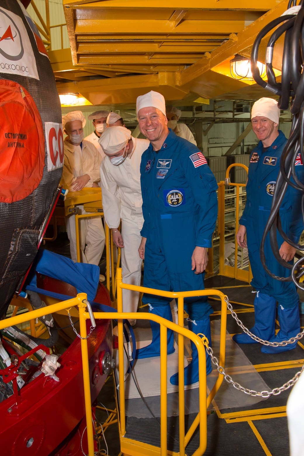 In the Integration Facility at the Baikonur Cosmodrome in Kazakhstan, Expedition 46-47 crewmember Tim Kopra of NASA (left) waits to board the Soyuz TMA-19M spacecraft during a crew fit check Dec. 1 while Tim Peake of the European Space Agency (right) looks on. Kopra, Peake and Yuri Malenchenko of the Russian Federal Space Agency (Roscosmos) will launch Dec. 15 from Baikonur for a six-month mission on the International Space Station. NASA/Victor Zelentsov