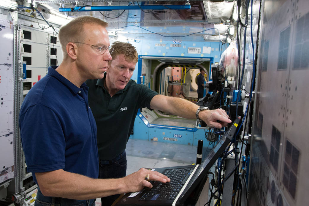 JSC2014-E-084745 (30 Sept. 2014) — NASA astronaut Tim Kopra (foreground), Expedition 46 flight engineer and Expedition 47 commander; and European Space Agency astronaut Timothy Peake, Expedition 46/47 flight engineer, participate in a routine operations training session in an International Space Station mock-up/trainer in the Space Vehicle Mock-up Facility at NASA’s Johnson Space Center. Photo credit: NASA/James Blair