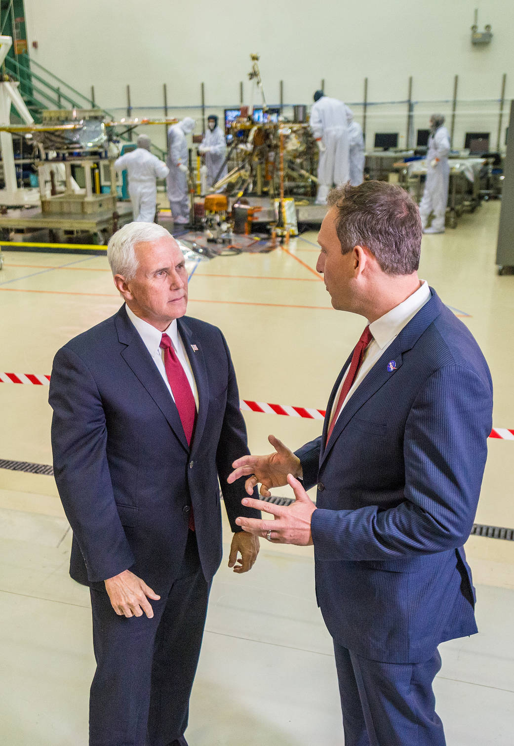 Vice President Mike Pence, left, speaks with Thomas Zurbuchen, NASA’s associate administrator for the Science Mission Directorate, right, in a clean room facility near Denver, Colorado, where Lockheed Martin Space Systems is assembling and testing InSight, NASA’s next spacecraft to Mars.