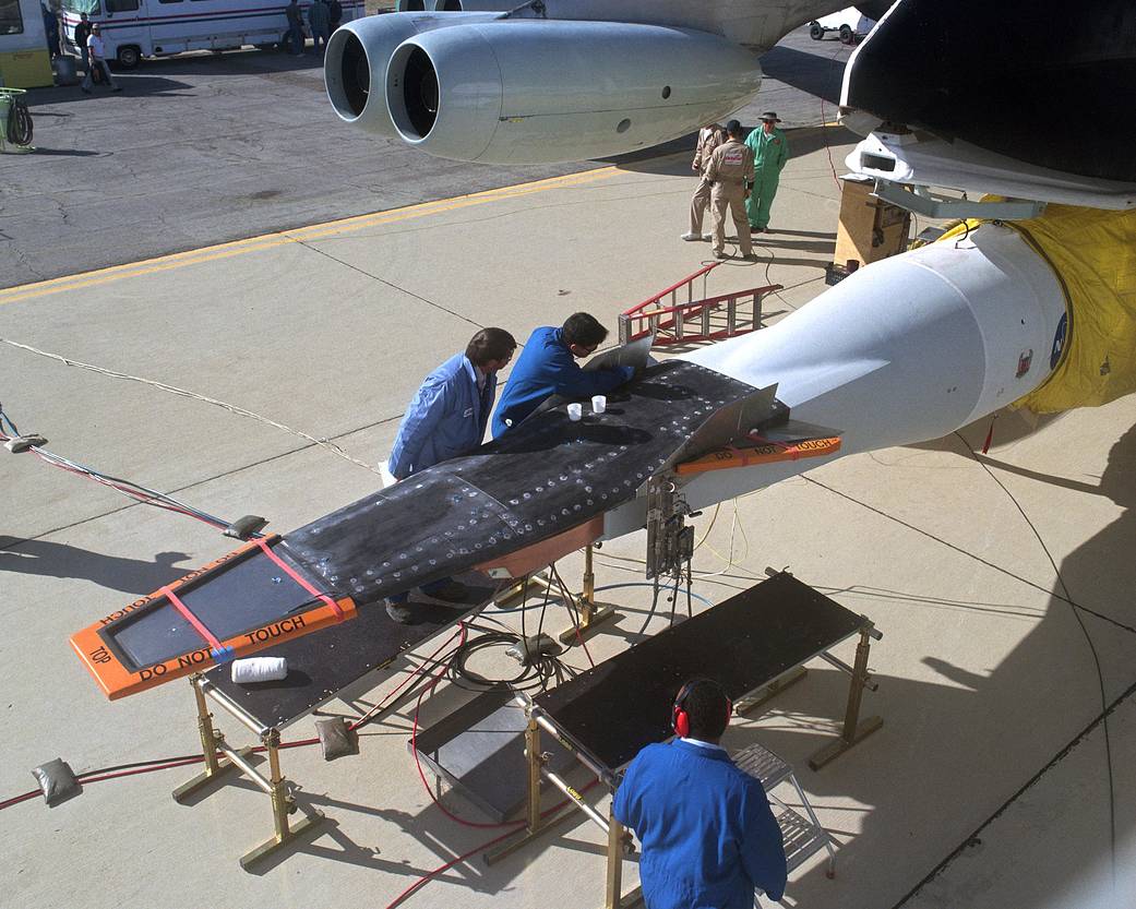 The second X-43A hypersonic research vehicle, mounted under the right wing of the B-52B launch aircraft, viewed from the B-52 cockpit. The crew is working on closing out the research vehicle, preparing it for flight.March 27, 2004NASA Photo / Tony Landis› X-43A Project Description