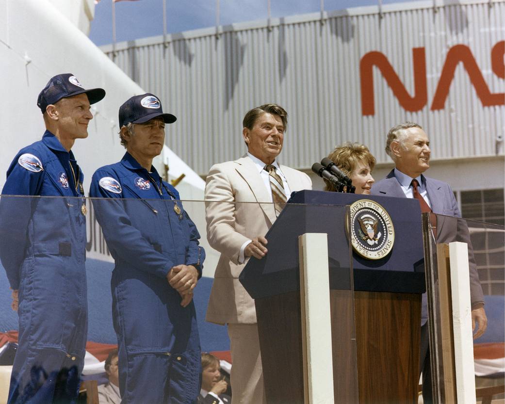 President Ronald Reagan speaks to a crowd of more than 45,000 people at NASA’s Dryden Flight Research Center following the landing of STS-4 on July 4, 1982.