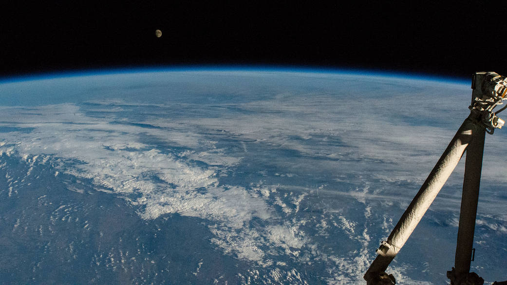 iss068e012259 (Oct. 6, 2022) — The waxing gibbous Moon is pictured above the Earth’s horizon as the International Space Station orbited 264 miles above the Netherlands. In the right foreground, is the Japanese robotic arm that supports payload operations outside the Kibo laboratory module.