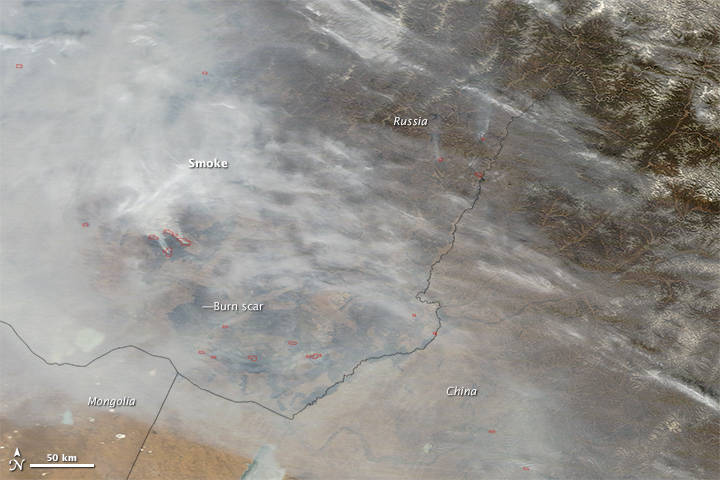 Farmers in the steppe of southern Siberia have an old tradition of burning dried grass in the spring to fertilize the soil for the coming year. In April 2015, unusually warm temperatures and strong winds turned the tradition into a nightmare. Several fires escaped the control of their handlers and spread rapidly across the dry landscape. According to media reports, escaped fires had devastated several villages, caused the deaths of about two dozen people, and left thousands of people homeless. Several smoky fires burned in Zabaikalsky Territory on April 14, 2015, when the Moderate Resolution Imaging Spectroradiometer (MODIS) on NASA’s Terra satellite acquired this image. The fires are outlined in red. Several dark burn scars are visible through the smoke.