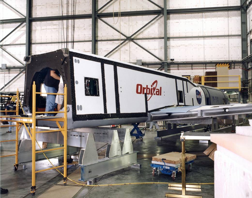 X-34 technology testbed demonstrator. Specific technologies built into the vehicle include composite structures, composite reusable propellant fuel tanks, an advanced thermal protection system, low-cost avionics, leading-edge tiles, and autonomous flight operation systems.1999NASA Photo / Tom Tschida› X-34 Project Description
