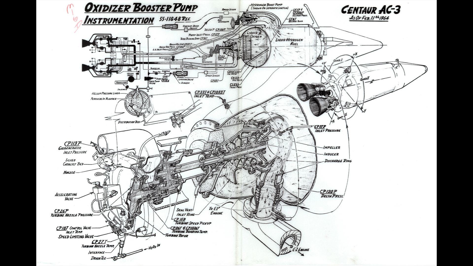 Drawing of the boost pump used on the Atlas Centaur-3. Testing of the Centaur propellant feed system in the B-3 stand and at B-2 led to the eventual elimination of the boost pumps from the Centaur design.
