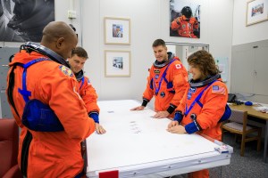 Inside the Astronaut Crew Quarters at the Neil Armstrong Operations and Checkout Building at NASA’s Kennedy Space Center in Florida, Artemis II crew members (from left) NASA astronauts Victor Glover, Reid Wiseman, CSA (Canadian Space Agency) astronaut Jeremy Hansen, and NASA astronaut Christina Koch are shown wearing test versions of the Orion crew survival system spacesuits they will wear on launch day as part of an integrated ground systems test on Wednesday, Sept. 20.
