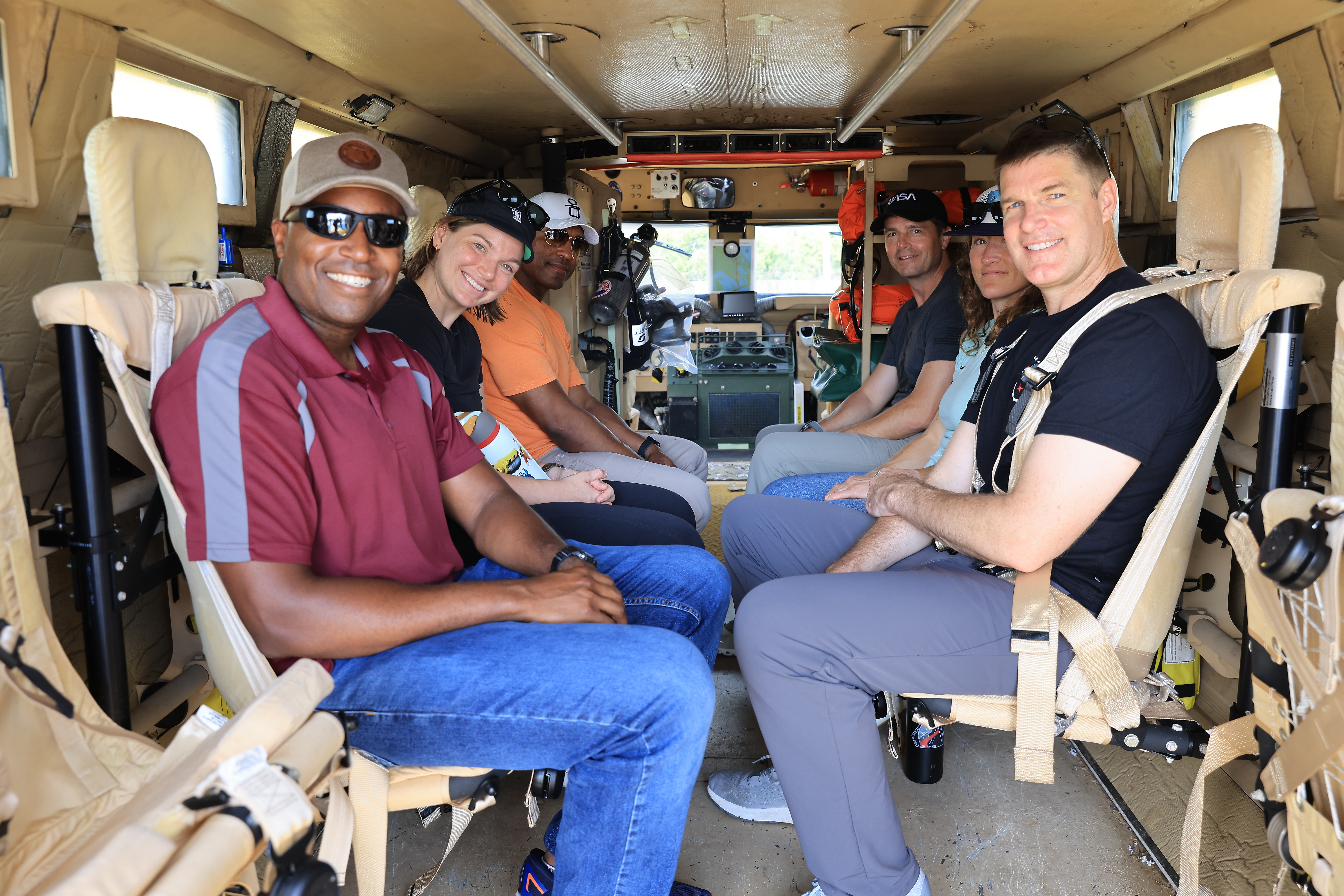 Crew members and backup members for NASA’s Artemis II mission and teams from the agency’s Exploration Ground Systems Program participate in emergency egress training at Launch Complex 39B at NASA’s Kennedy Space Center in Florida on Tuesday, May 6, 2025. From left, Andre Douglas, NASA’s Artemis II backup crew member; CSA (Canadian Space Agency) astronaut Jenni Gibbons, Artemis II backup crew member; NASA astronaut Victor Glover, Artemis II pilot; NASA astronaut Reid Wiseman, Artemis II commander; NASA astronaut Christina Koch, Artemis II mission specialist; and CSA astronaut Jeremy Hansen, Artemis II mission specialist sit in the back of a mine-resistant ambush protected vehicle, or MRAP. Originally designed for military applications, the 45,000-pound MRAP offers a mobile bunker for astronauts and ground crews in the unlikely event they must get away from the launch pad quickly in an emergency.