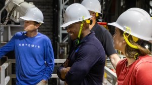 From left, NASA astronaut Reid Wiseman, Artemis II commander; NASA astronaut Victor Glover, Artemis II pilot; and CSA (Canadian Space Agency) astronaut Jenni Gibbons, Artemis II backup crew member, participate in emergency egress training with teams from the agency’s Exploration Ground Systems Program inside the Vehicle Assembly Building at NASA’s Kennedy Space Center in Florida on Monday, May 5, 2025. Artemis II will take four astronauts around the Moon, the first crewed mission on NASA’s path to establishing a long-term presence for science and exploration through Artemis.