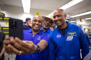 NASA astronaut Victor Glover takes photos during a visit on Friday, Nov. 8, 2024, with employees at NASA’s Kennedy Space Center in Florida. The employees support the agency’s Exploration Ground Systems Program to help NASA send astronauts, including Glover, to the Moon and back through the Artemis II launch.