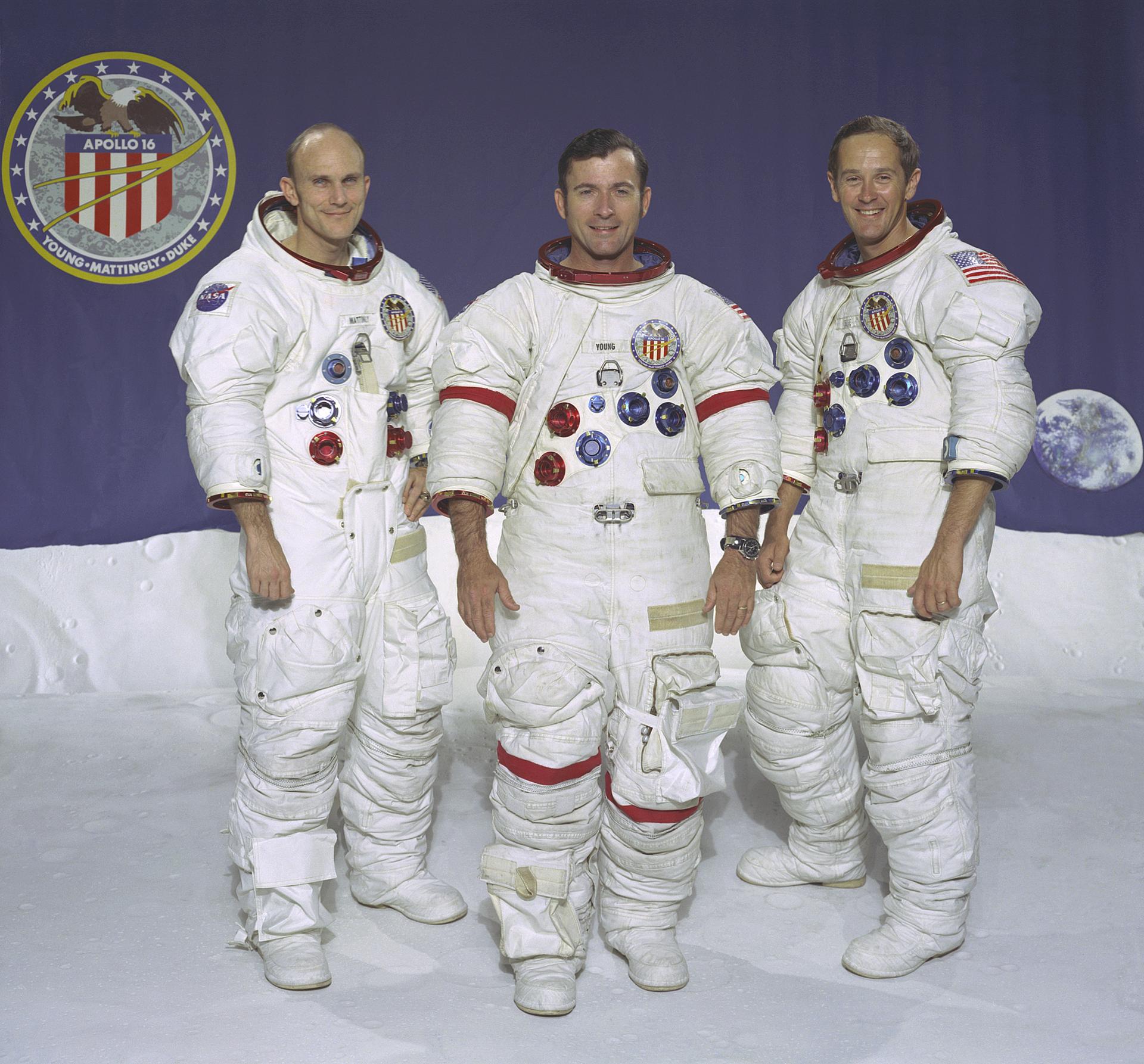This is the Apollo 16 lunar landing mission crew portrait. Pictured from left to right are: Thomas K. Mattingly II, Command Module pilot; John W. Young, Mission Commander; and Charles M. Duke Jr., Lunar Module pilot. Launched from the Kennedy Space Center on April 16, 1972, Apollo 16 spent three days on Earth's Moon. The first study of the highlands area, the landing site for Apollo 16 was the Descartes Highlands. The fifth lunar landing mission out of six, Apollo 16 was famous for deploying and using an ultraviolet telescope as the first lunar observatory. The telescope photographed ultraviolet light emitted by Earth and other celestial objects. The Lunar Roving Vehicle, developed by the Marshall Space Flight Center, was also used for collecting rocks and data on the mysterious lunar highlands. In this photo, astronaut John W. Young photographs Charles M. Duke, Jr. collecting rock samples at the Descartes landing site. Duke stands by Plum Crater while the Lunar Roving Vehicle waits parked in the background. High above, Thomas K. Mattingly orbits in the Command Module. The mission ended April 27, 1972 as the crew splashed down into the Pacific Ocean.