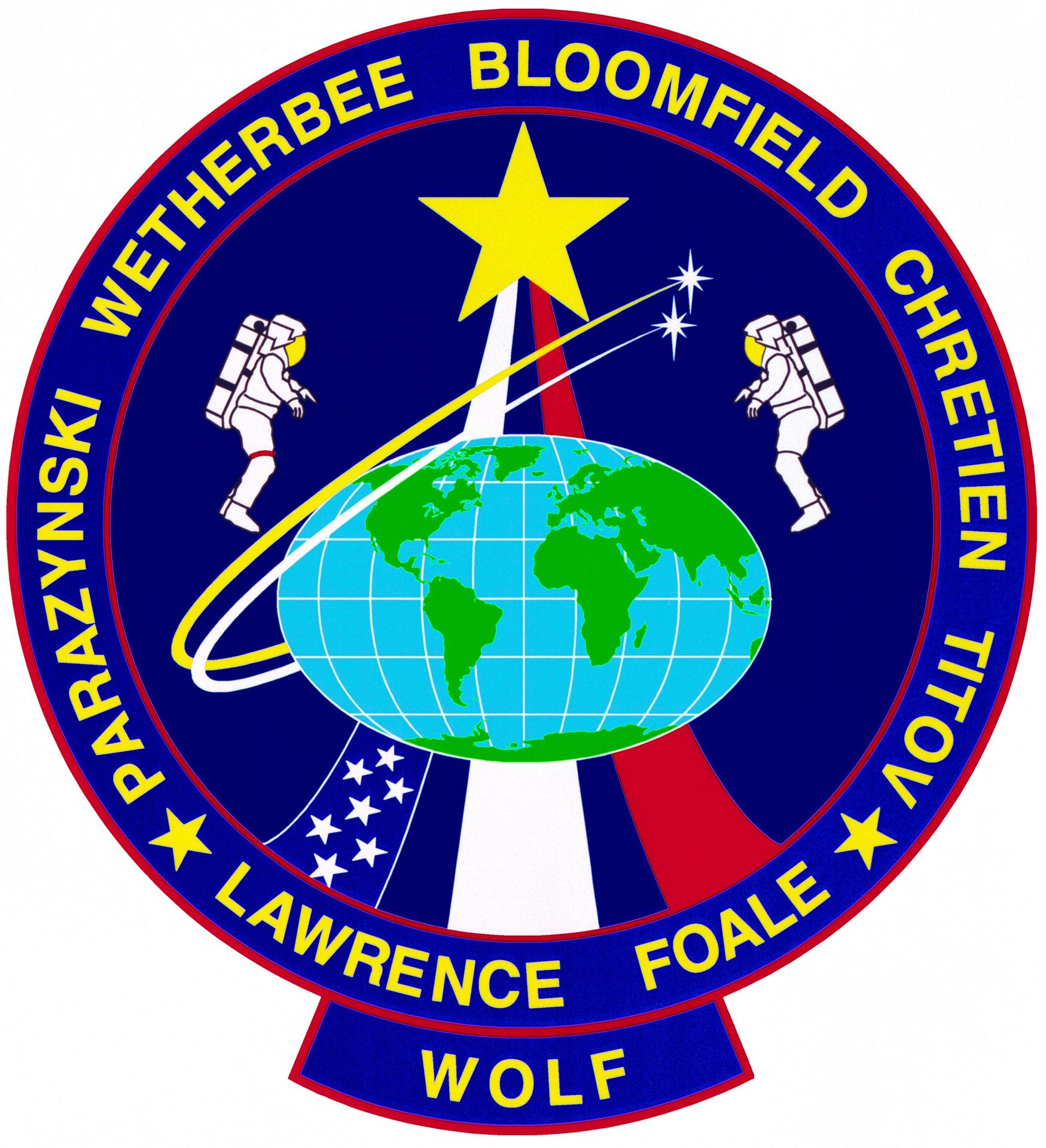The STS-86 flight was the seventh shuttle-Mir docking mission, symbolized by seven stars. The international crew includes astronauts from the United States, Russia, and France. The flags of these nations are incorporated in the rays of the astronaut logo. The rays of light streaking across the sky depict the orbital tracks of the two spacecraft as they prepare to dock. During the flight, an American astronaut and a Russian cosmonaut will perform an extravehicular activity (EVA). The mercator projection of Earth illustrates the global cooperative nature of the flight.