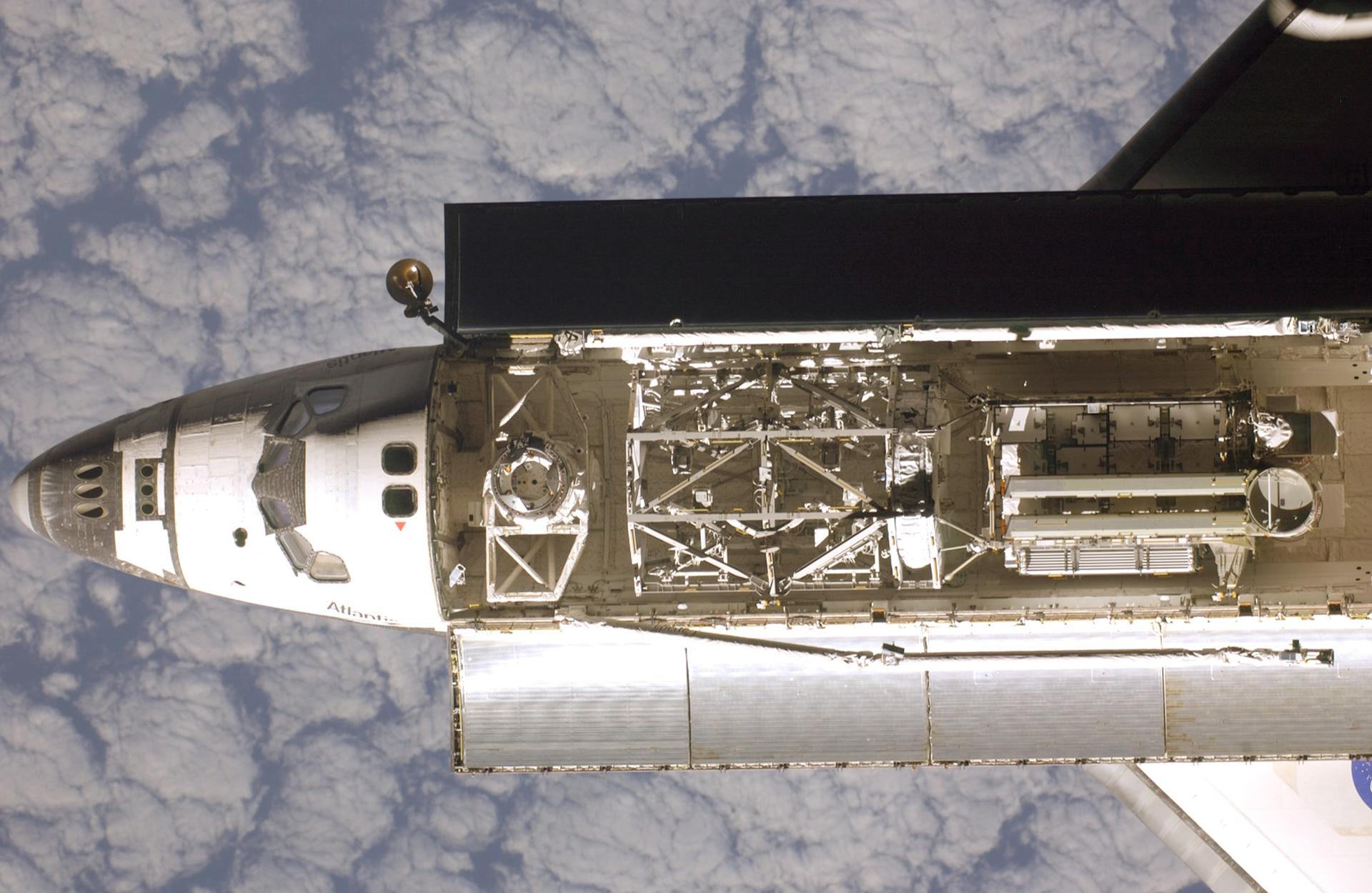 This nadir view of the STS-117 mission Space Shuttle Atlantis, taken by the Expedition 15 crew aboard the International Space Station (ISS), occurred just before the two spacecraft linked up in Earth orbit. Berthed in the cargo bay are the 17.8 ton second and third (S3 and S4) truss segments ready for installment. STS-117 mission objectives included the addition of S3 and S4 with Photovoltaic Radiator (PVR), the deployment of the third set of solar arrays, and the retraction of the P4 starboard solar array wing and one radiator.