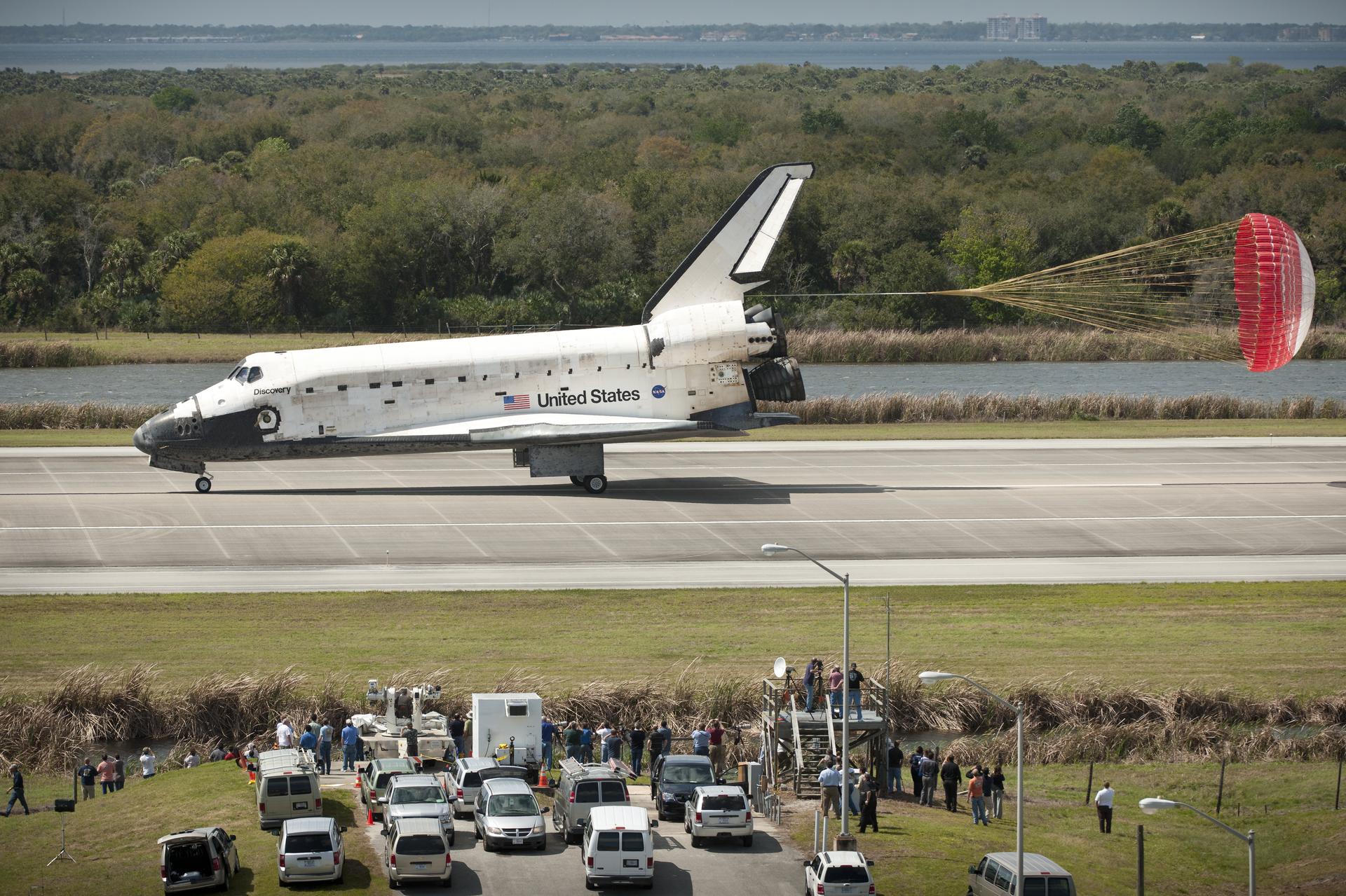 Space Shuttle Discovery (STS-133) lands, Wednesday, March 9, 2011, at Kennedy Space Center in Cape Canaveral, Fla., completing its 39th and final flight. Since 1984, Discovery flew 39 missions, spent 365 days in space, orbited Earth 5,830 times and traveled 148,221,675 miles. Photo credit: (NASA/Bill Ingalls)