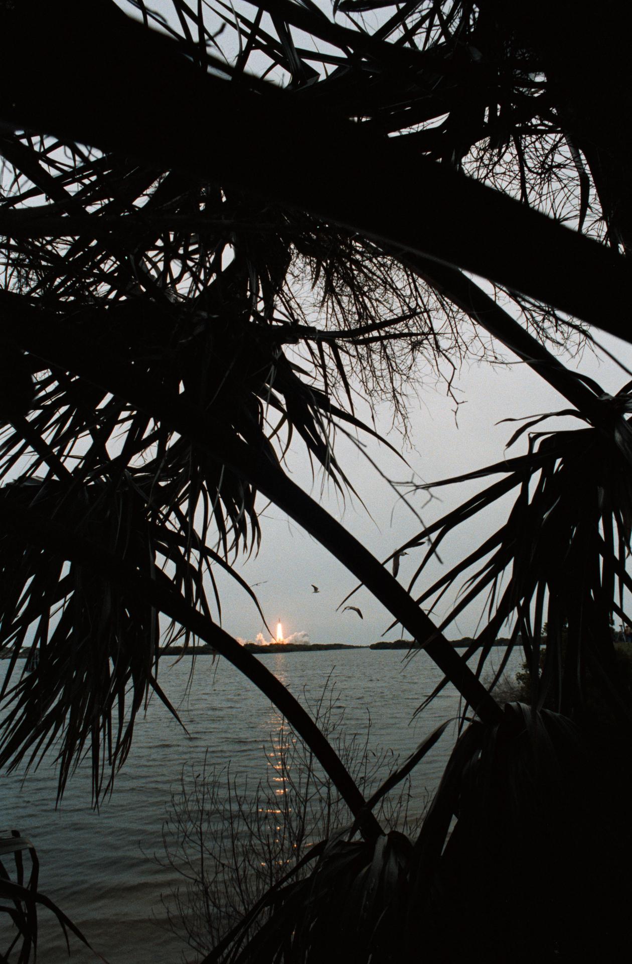 Just below center of this scene is a distant representation of a large ignition as the Shuttle Discovery lifts off from a Kennedy Space Center (KSC) launch pad. The ignition can be seen through the fronds of the trees. Birds in flight frame the light spot representing the orbiter as it launches.