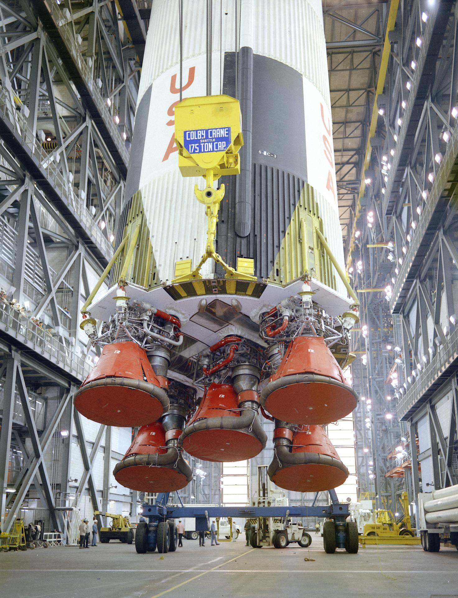 The S-IC stage being erected for the final assembly of the Saturn V launch vehicle for the Apollo 8 mission (AS-503), is photographed in the Vehicle Assembly Building (VAB) high bay at the Kennedy Space Center. The Apollo 8 mission was the first Saturn V manned mission with astronauts Frank Borman, James A. Lovell, and William Anders. They escaped Earth's gravity and traveled to lunar vicinity. The launch of Apollo 8 occurred on December 21, 1968.