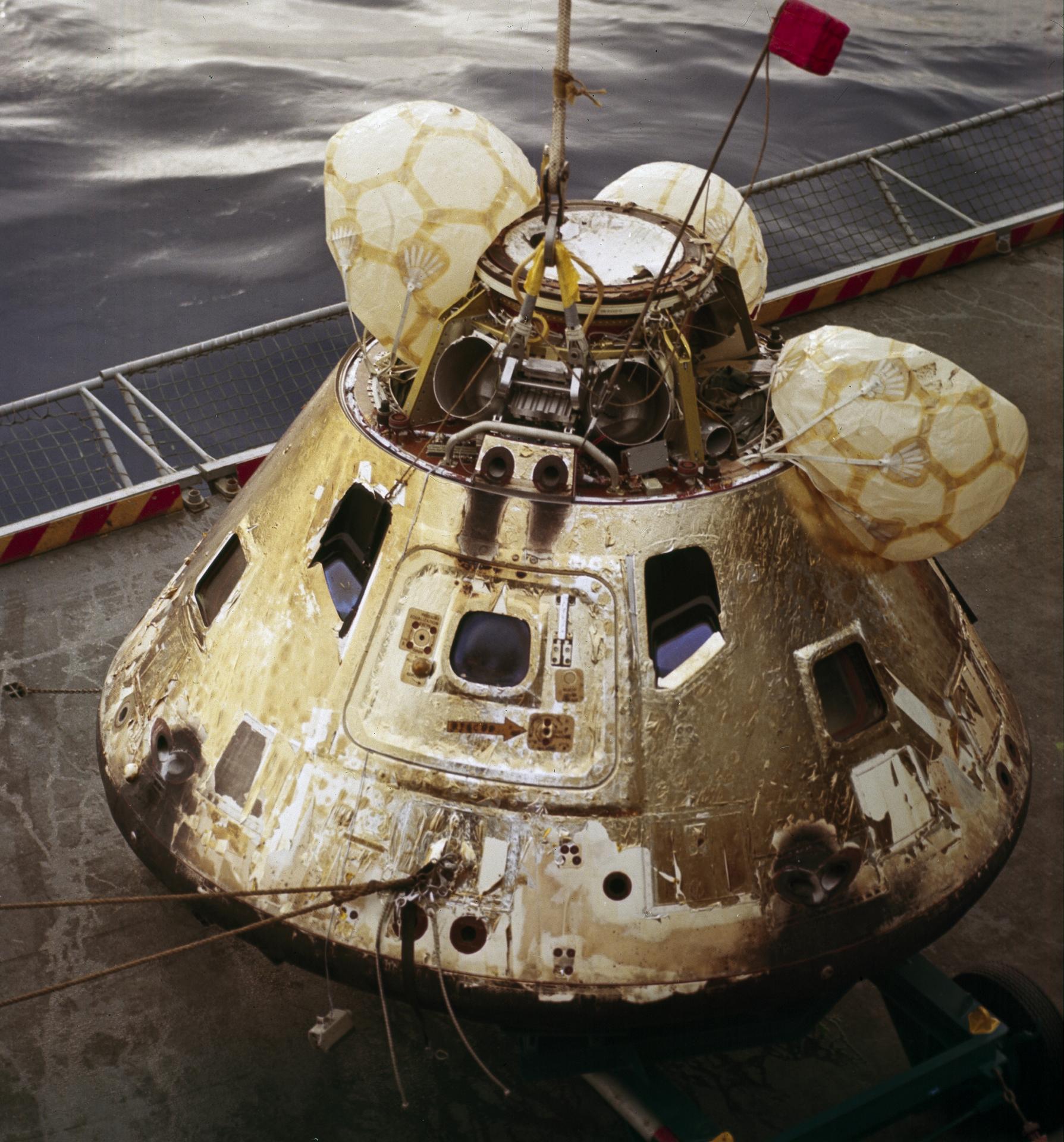 This is a photograph of the Apollo 8 Capsule being hoisted onto the recovery ship following splashdown on December 27, 1968. The first manned Apollo mission to escape Earth’s gravity and travel to the lunar vicinity, the Saturn V, SA-503, Apollo 8 mission liftoff occurred seven days prior, on December 21, 1968. Aboard were astronauts William Anders, Lunar Module (LM) Pilot; James Lovell, Command Module (CM) pilot; and Frank Borman, commander. The mission achieved operational experience and tested the Apollo command module systems, including communications, tracking, and life-support, in cis-lunar space and lunar orbit, and allowed evaluation of crew performance on a lunar orbiting mission. The crew photographed the lunar surface, both far side and near side, obtaining information on topography and landmarks as well as other scientific information necessary for future Apollo landings. All systems operated within allowable parameters and all objectives of the mission were achieved.