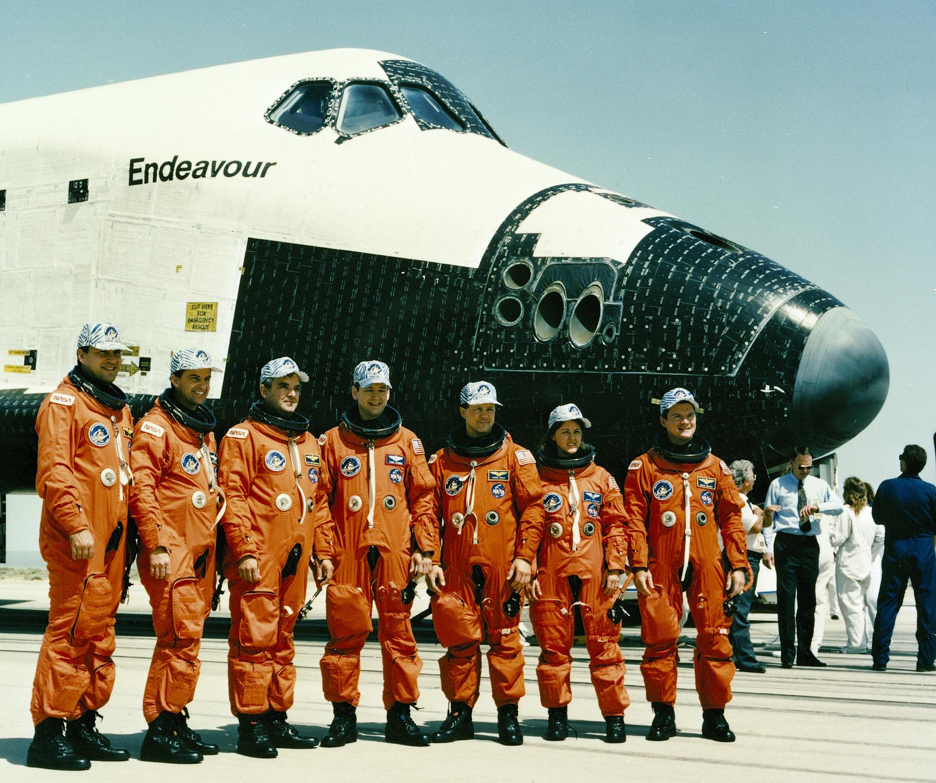 The STS-49 crew members pose near Endeavour after landing. Pictured left to right are: Richard J. Hieb, mission specialist; Kevin P. Chiltin, pilot; Daniel C. Brandenstein, commander; and mission specialists Thomas D. Akers, Pierre J. Thuot, Kathryn C. Thornton, and Bruce E. Melnick. Launched on May 7, 1992 at 7:40:00 pm (EDT), the crew of seven was the first to fly aboard the Space Shuttle Endeavor. The mission was the first US orbital flight to feature 4 extravehicular activities (EVAs), and the first flight to involve 3 crew members simultaneously working outside of the spacecraft. The primary objective was the capture and redeployment of the INTELSAT VI (F-3) which was stranded in an unusable orbit since its launch aboard the Titan rocket in March 1990.