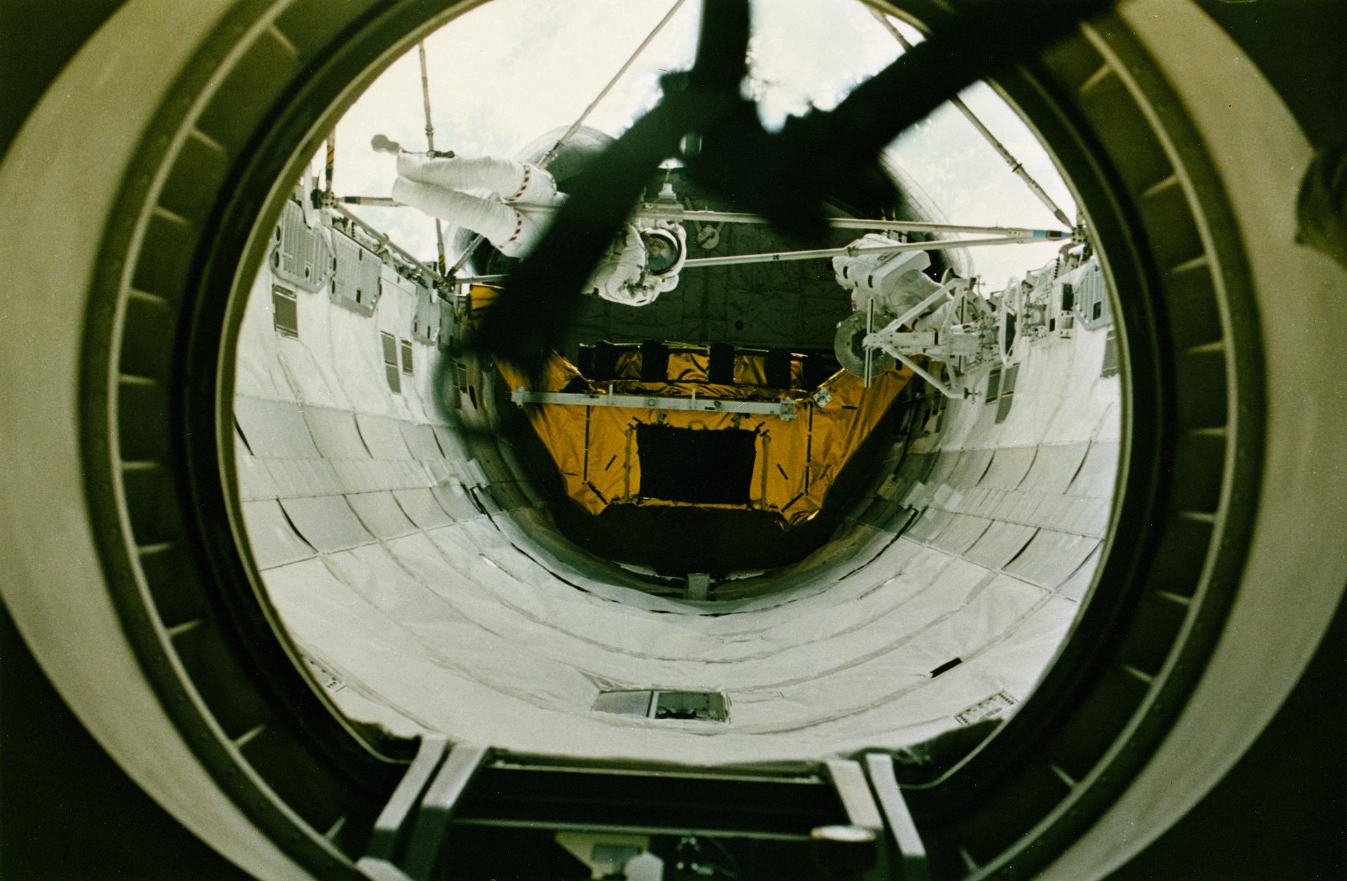 STS-49, the first flight of the Space Shuttle Orbiter Endeavour, lifted off from launch pad 39B on May 7, 1992 at 6:40 pm CDT. The STS-49 mission was the first U.S. orbital flight to feature 4 extravehicular activities (EVAs), and the first flight to involve 3 crew members working simultaneously outside of the spacecraft. The primary objective was the capture and redeployment of the INTELSAT VI (F-3), a communication satellite for the International Telecommunication Satellite organization, which was stranded in an unusable orbit since its launch aboard the Titan rocket in March 1990. A view through Endeavour’s busy airlock reveals astronauts Thomas Akers and Kathryn Thornton.