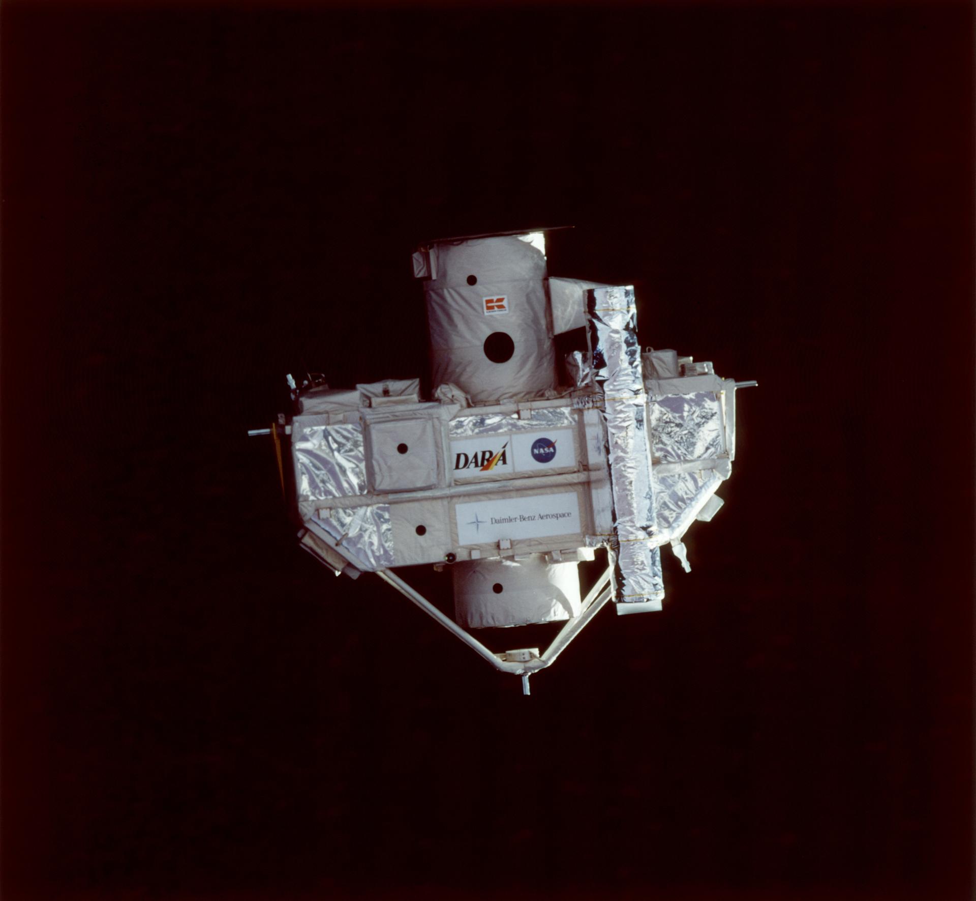 This STS-80 onboard photograph shows the Orbiting Retrievable Far and Extreme Ultraviolet Spectrometer-Shuttle Pallet Satellite II (ORFEUS-SPAS II), photographed during approach by the Space Shuttle Orbiter Columbia for retrieval. Built by the German Space Agency, DARA, the ORFEUS-SPAS II, a free-flying satellite, was dedicated to astronomical observations at very short wavelengths to: investigate the nature of hot stellar atmospheres, investigate the cooling mechanisms of white dwarf stars, determine the nature of accretion disks around collapsed stars, investigate supernova remnants, and investigate the interstellar medium and potential star-forming regions. Some 422 observations of almost 150 astronomical objects were completed, including the Moon, nearby stars, distant Milky Way stars, stars in other galaxies, active galaxies, and quasar 3C273. The STS-80 mission was launched November 19, 1996.