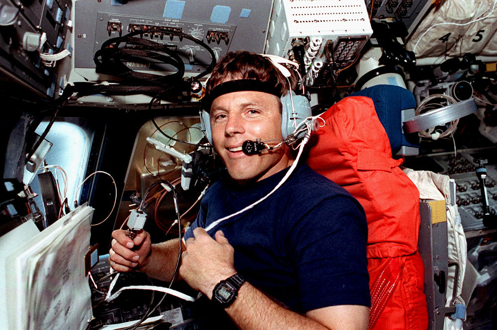 Space Shuttle Discovery (STS-56) onboard photo of Pilot Stephen S. Oswald (wearing a headset) uses the Shuttle Amateur Radio Experiment II (SAREX-II) while sitting at the pilot's station on the forward flight deck. Oswald smiled from behind the microphone as he talks to amateur radio operators on Earth via the SAREX equipment. SAREX cables and the interface module freefloat in front of Oswald. The anterna located in the forward flight deck window is visible in the background. SAREX was established by NASA, the American Radio League/Amateur Radio Satellite Corporation and the Johnson Space Center (JSC) Amateur Radio Club to encourage public participation in the space program through a program to demonstrate the effectiveness of conducting short-wave radio transmissions between the Shuttle and ground-based radio operators at low-cost ground stations with amateur and digital techniques.