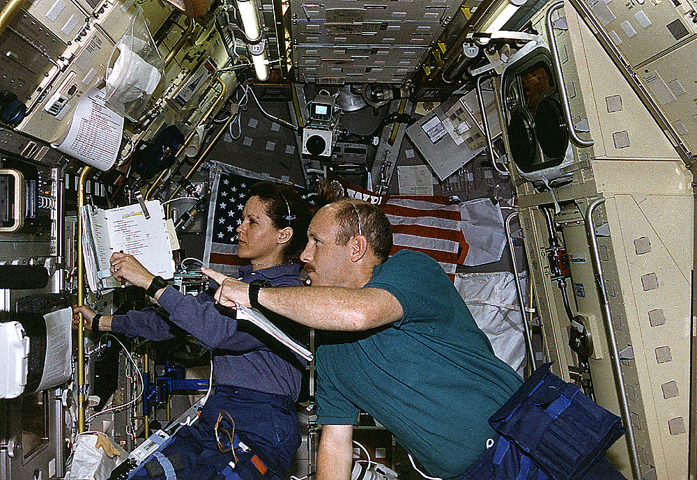 Onboard Space Shuttle Columbia (STS-73) Payload Commander Kathryn Thornton and Commander Ken Bowersox discuss the Drop Physics Module (DPM) experiment in the United States Microgravity Laboratory 2 (USML-2) spacelab science module.