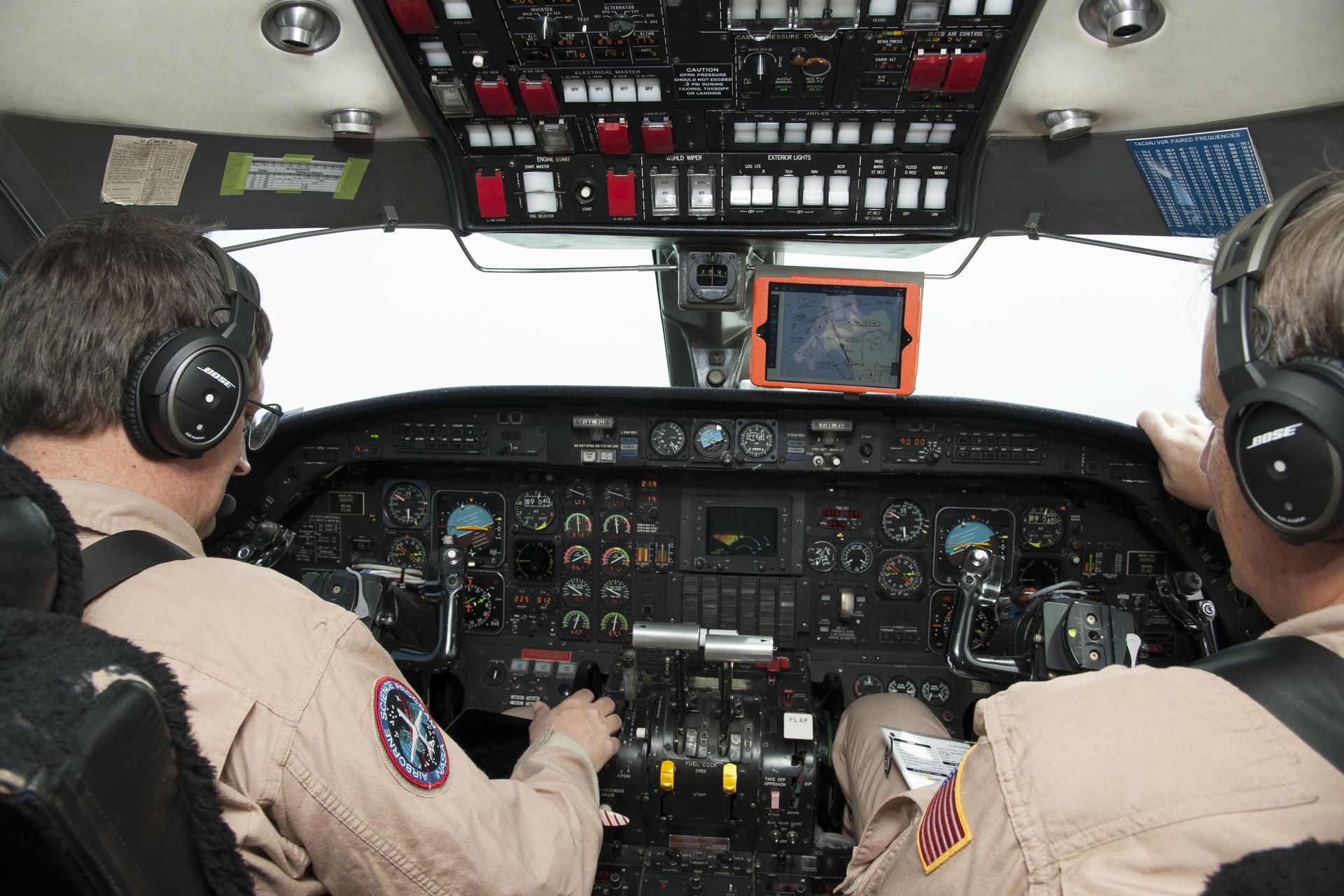 Armstrong Pilots David Fedors and Stu Broce are at the controls of the C-20A in March 2016 as it flies a synthetic aperture radar over areas of interest in the AfriSAR mission based in Gabon, Africa. The international campaign included measurements of flora in the country’s rainforests, wetlands, mangrove forests and savanna.