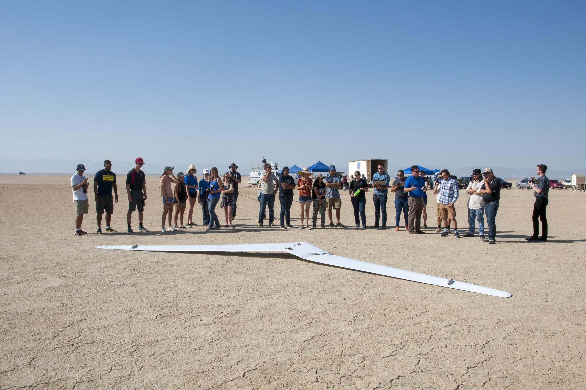 Student interns and NASA personnel cluster in front of PRANDTL-D No. 3 following a crash on Rosamond Dry Lake. The radio-controlled glider was built to validate a new spanload.