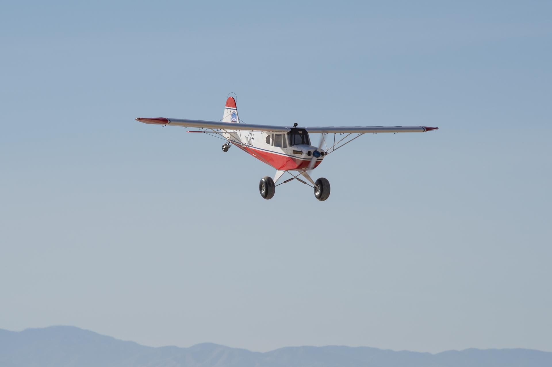 The MicroCub, a modified a Bill Hempel 60-percent-scale super cub, approaches for a landing at NASA's Armstrong Flight Research Center. This was the first flight of the MicroCub in which the crew validated the airworthiness of the aircraft.