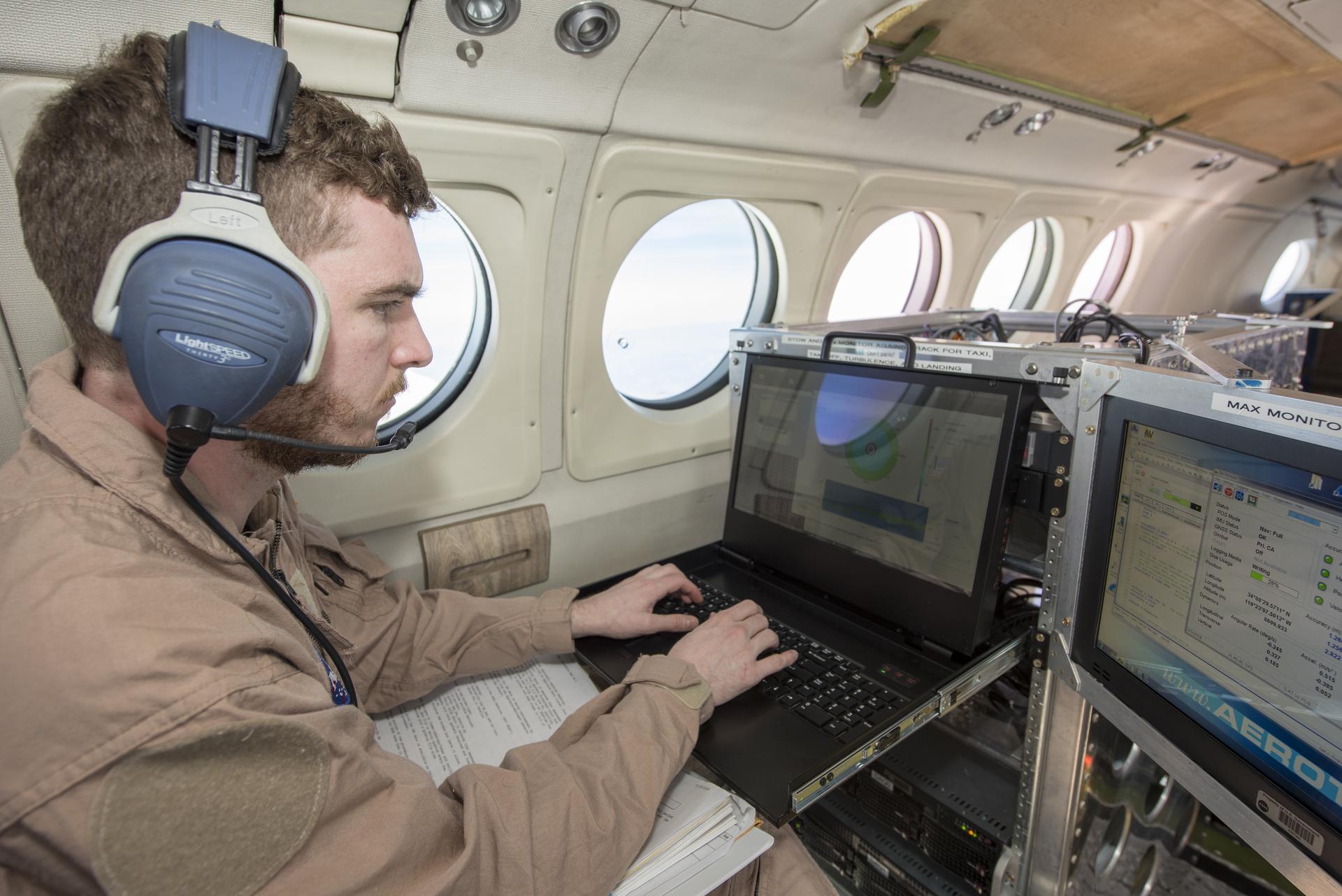 Radar operator Alexander Winteer monitors incoming wind data from the DopplerScatt radar instrument during a science flight off the California Coast on March 5, 2018.