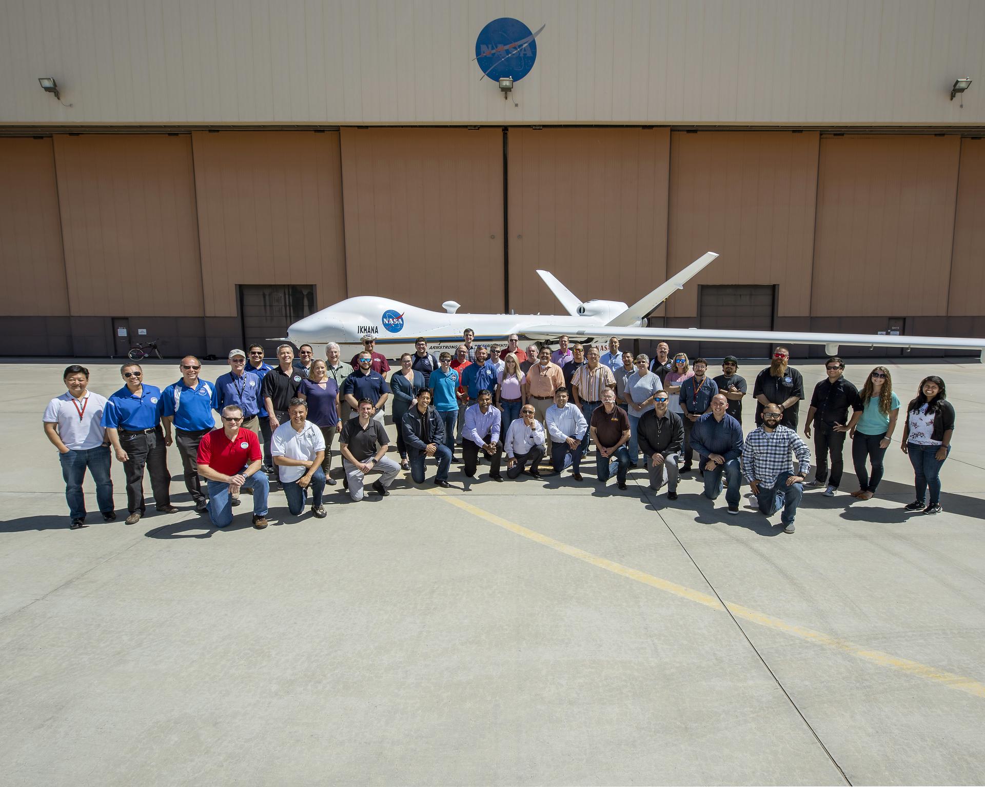 The No Chase COA (NCC) team at NASA Armstrong Flight Research Center pose for a group photo with the unmanned aircraft system the Ikhana.