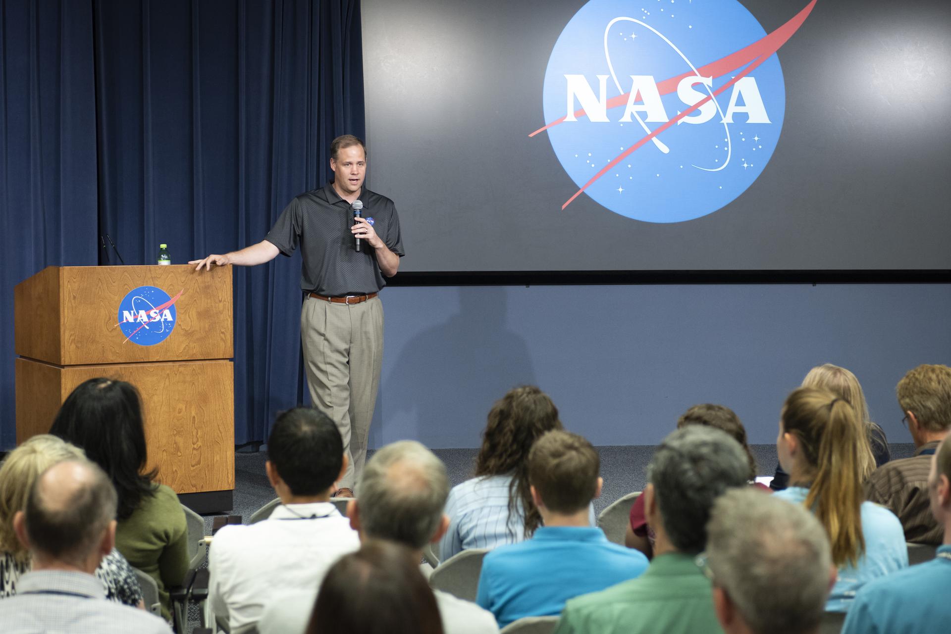 In Armstrong auditorium, Bridenstine discusses the future of NASA under his administration then answered questions from employees