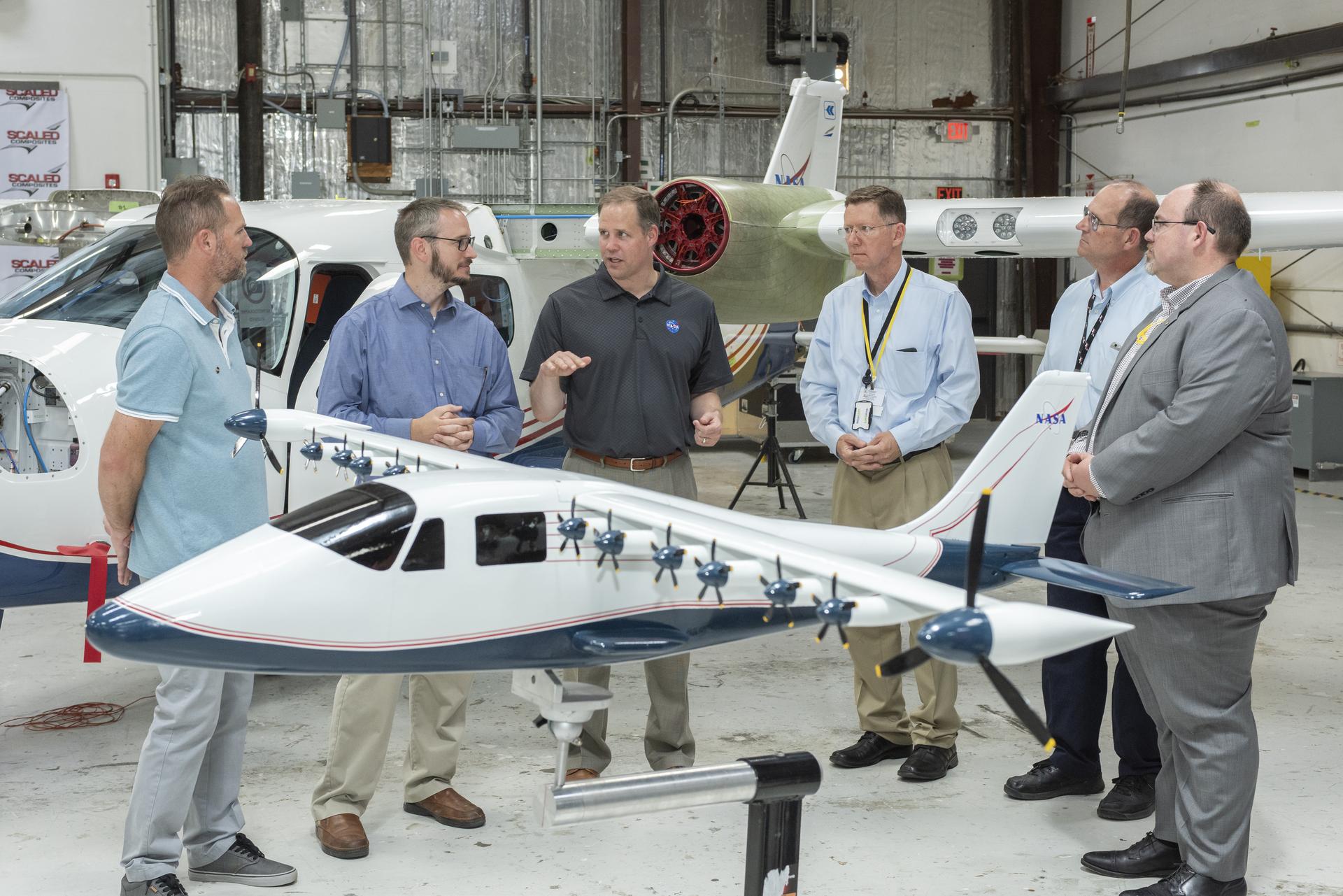 Armstrong X-57 team brief NASA Administrator Bridenstine about the progress of making a combustion aircraft into an all-electric airplane. X-57 is in Scaled Composites hangar at Mojave Air & Space Port in California. Model of the final aircraft design sta