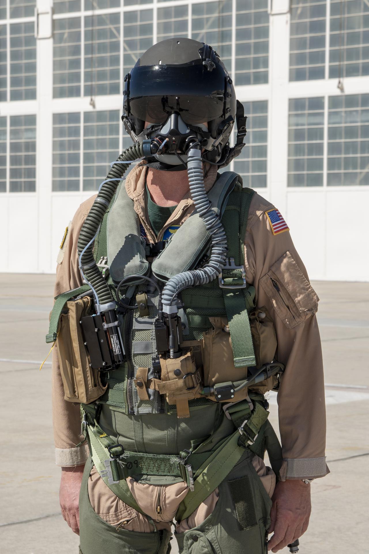 NASA Pilot Nils Larson wears a U.S. Navy harness configuration to show the integrated parachute harness and the built-in survival vest. The Navy configuration is bulkier and weighs more than the U.S. Air Force harness. Both configurations are being used in the Pilot Breathing Assessment program at NASA’s Armstrong Flight Research Center in California.