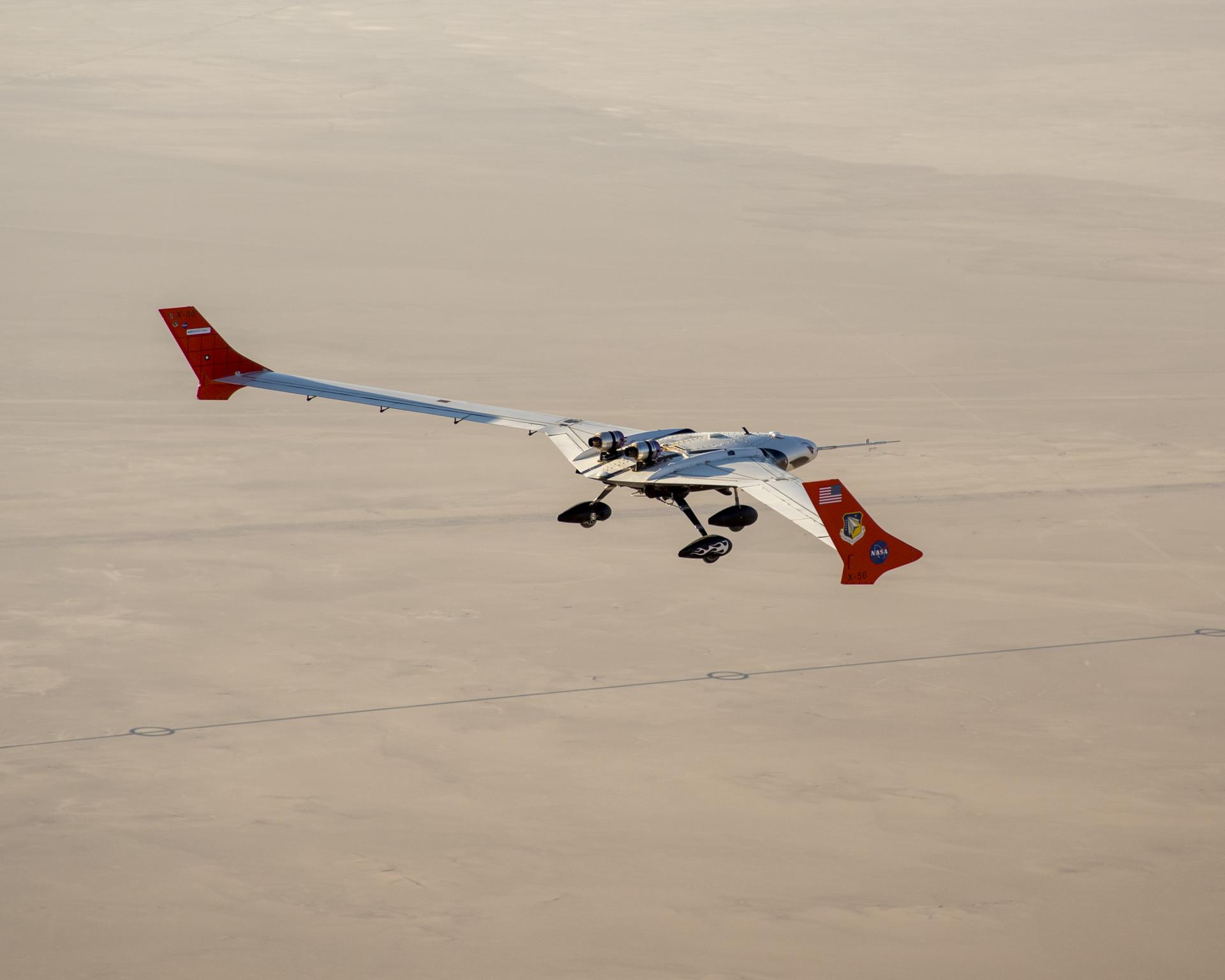 The X-56A flies a research flight in the skies above Edwards Air Force Base.