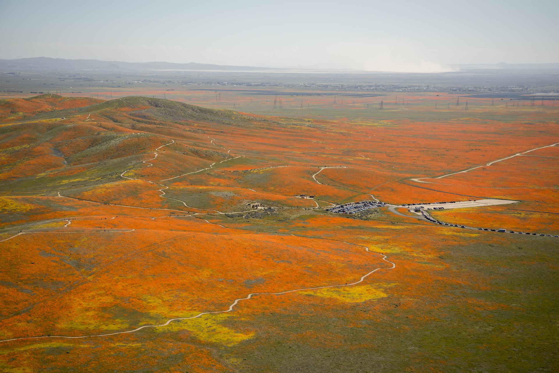 View from a NASA aircraft, TG-14, over the Superbloom of wildflowers and poppies from the Antelope Valley in Southern California and Poppy Reserve and solar panels in background