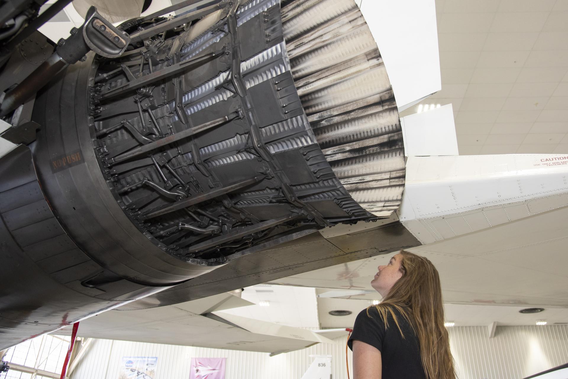 NASA’s 2017 astronaut candidates toured aircraft hangar at Armstrong Flight Research Center, in Southern California where Jenni Sidey-Gibbons looks inside engine nozzle of F-15 jet. The F-15 will fly in tandem with the X-59 QueSST during early flight test stages for the X-59 development.