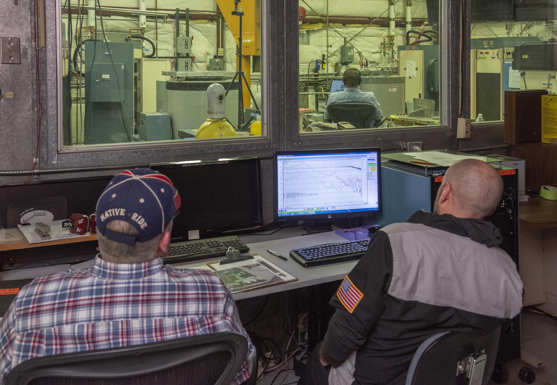 Engineers monitor data during vibration testing of a cruise motor controller for the X-57 Maxwell, NASA’s first all-electric X-plane. Attached to a table at NASA Armstrong Flight Research Center’s environmental lab, the cruise motor controller is exposed to specific levels of vibration, allowing NASA to examine the structural integrity of the hardware. Engineers, meanwhile, monitored data, including waveforms of electrical current, and recorded readings.
