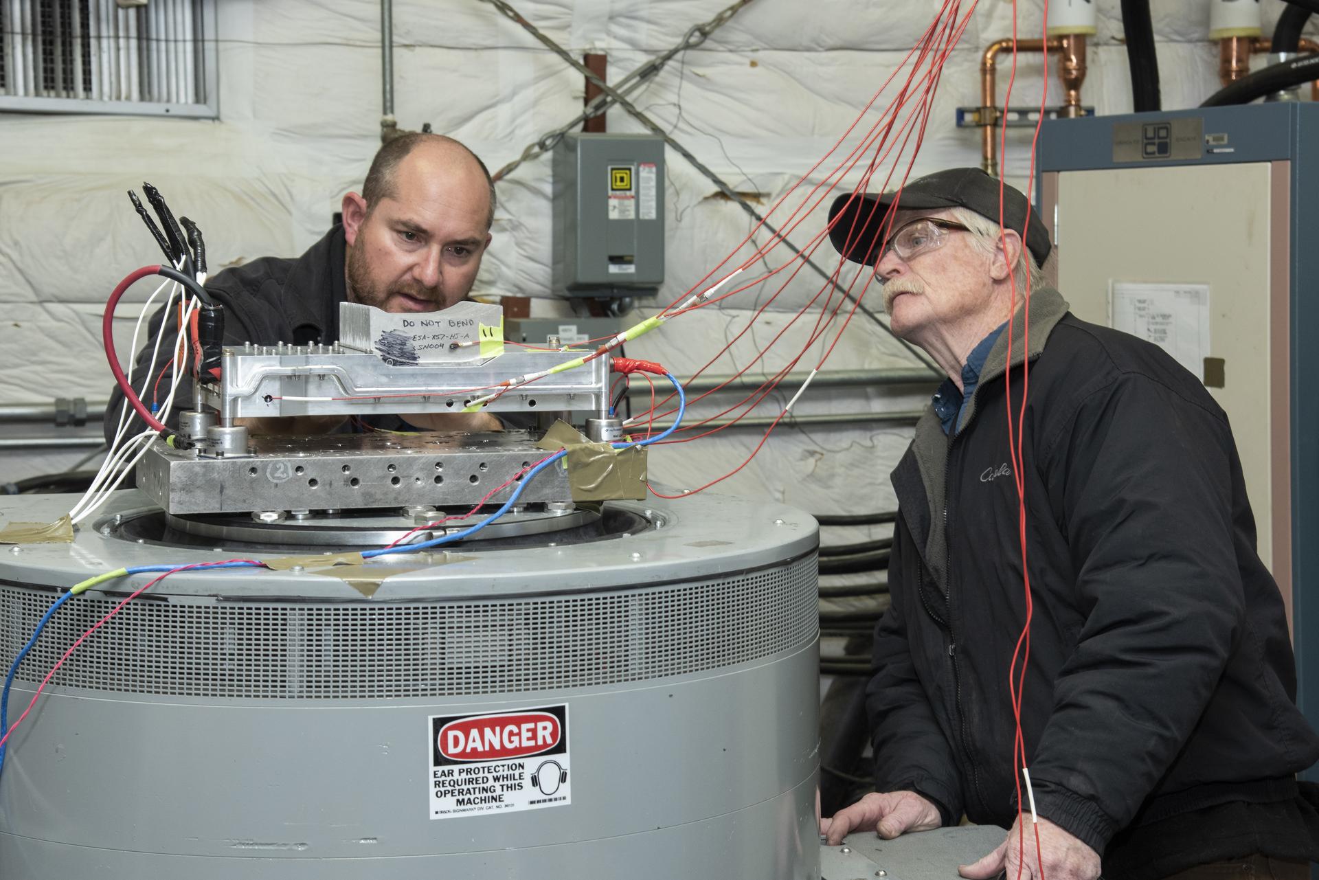 Engineers from NASA's Armstrong Flight Research Center and Empirical Systems Aerospace prepare a cruise motor controller, planned to be used on NASA's all-electric X-57 Maxwell, for vibration testing at Armstrong's environmental lab. Testing the cruise motor controller at various vibration levels, based on baseline flight testing in the project's first phase, helps ensure that the hardware will withstand similar vibration in flight conditions. X-57, NASAs first all-electric experimental aircraft, or X-plane, will fly in its first all-electric configuration in 2020.