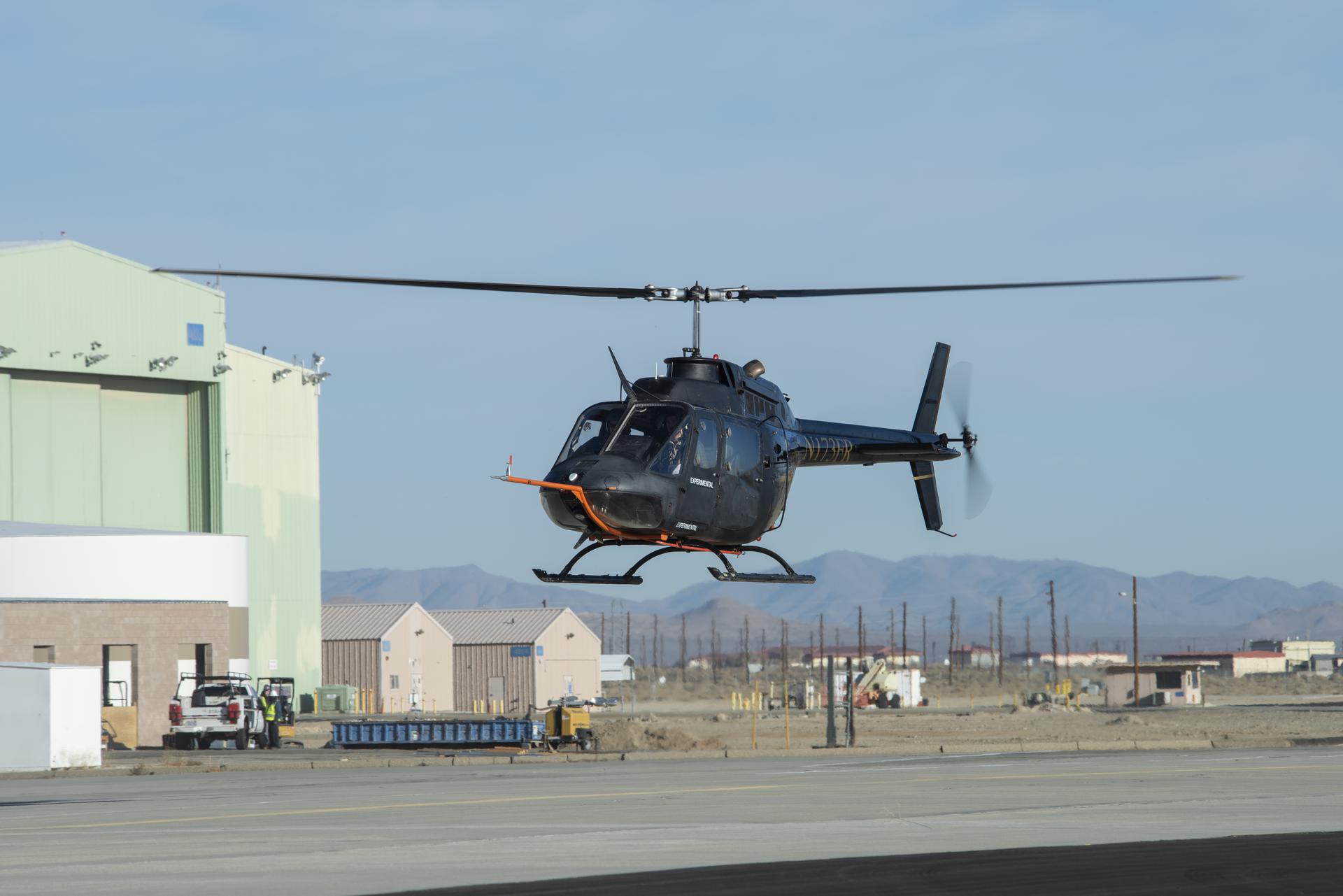 A Bell OH-58C Kiowa helicopter provided by Flight Research Inc. in Mojave, California, flies at NASA’s Armstrong Flight Research Center in California the first week of December 2020. The Advanced Air Mobility National Campaign project used the helicopter as a surrogate urban air mobility vehicle to develop a data baseline for future flight testing. Â