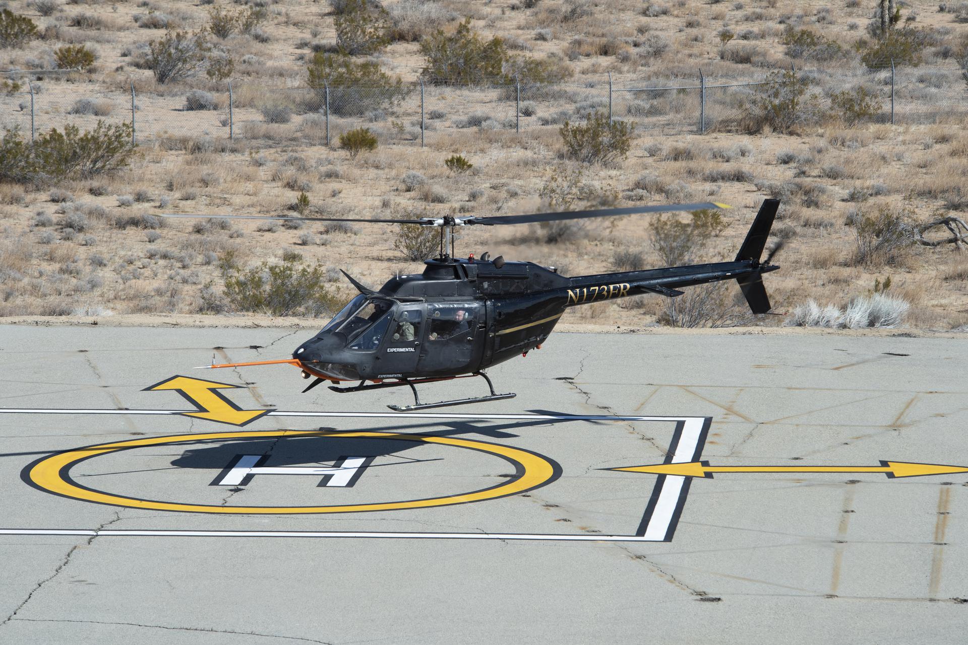 Flight Research Inc.’s Bell OH-58C Kiowa helicopter hovers over a helipad after completing an urban air mobility approach at NASA’s Armstrong Flight Research Center in California in March 2021. The Advanced Air Mobility National Campaign studied the viability of various urban air mobility approach options during a second phase called build II. This helicopter was used as a surrogate urban air mobility or air taxi vehicle.