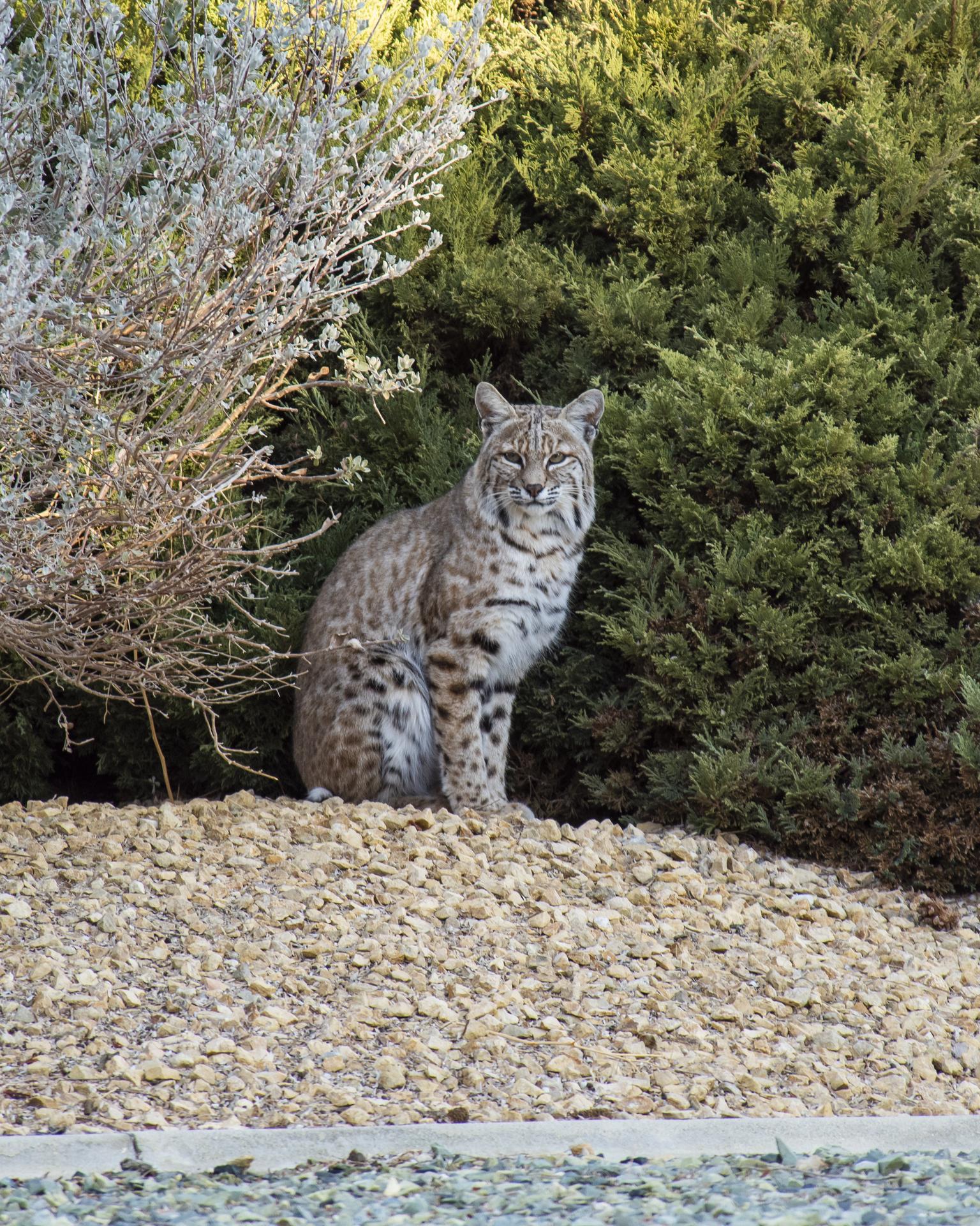 A bobcat surveying the landscape in between bushes at Armstrong Flight Research Center in Edwards, California. The spotted feline makes its home on the more than 300,000 acres of Mojave Desert surrounding the NASA facility housed at Edwards Air Force Base.