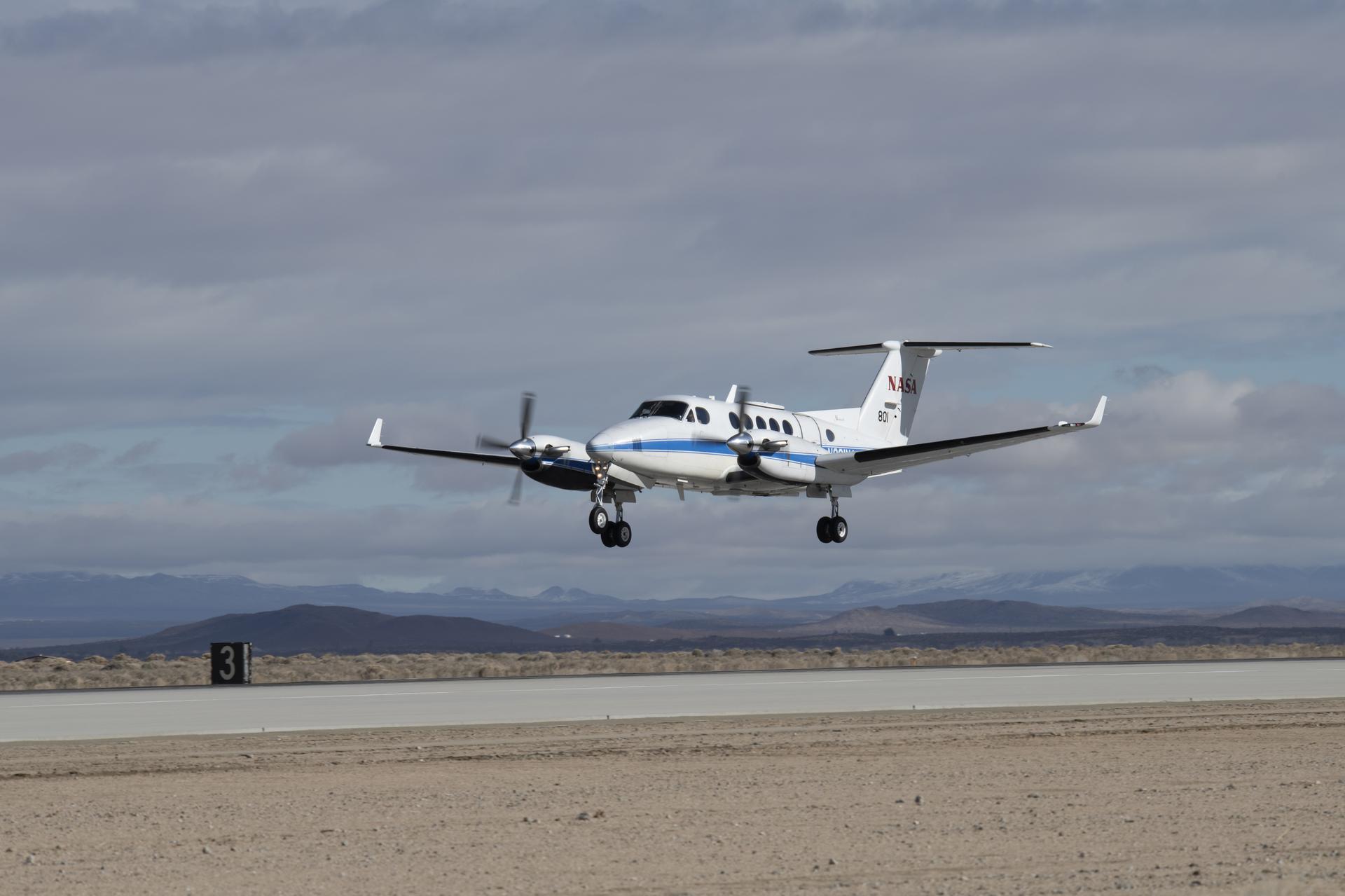 NASA’s Armstrong Flight Research Center in Edwards, California, flew the B200 King Air in support of the Signals of Opportunity Synthetic Aperture Radar (SoOpSAR) campaign on Feb. 27, 2023.