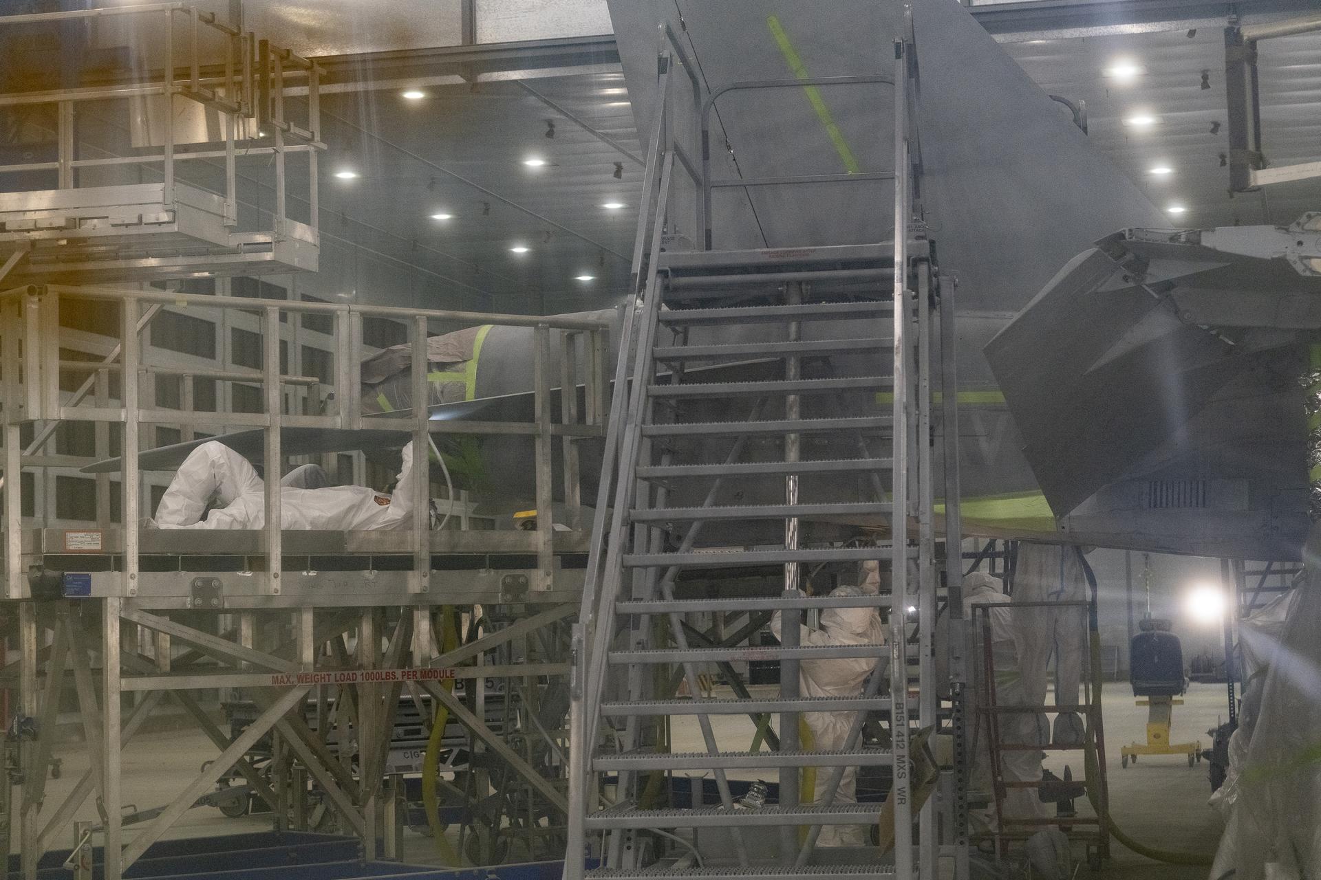 U.S. Air Force Corrosion Control Facility personnel work to sand NASA 862, which is an F/A-18D based at NASA’s Armstrong Flight Research Center in Edwards, California. The facility is located on Edwards Air Force Base and is also known as the Paint Barn.
