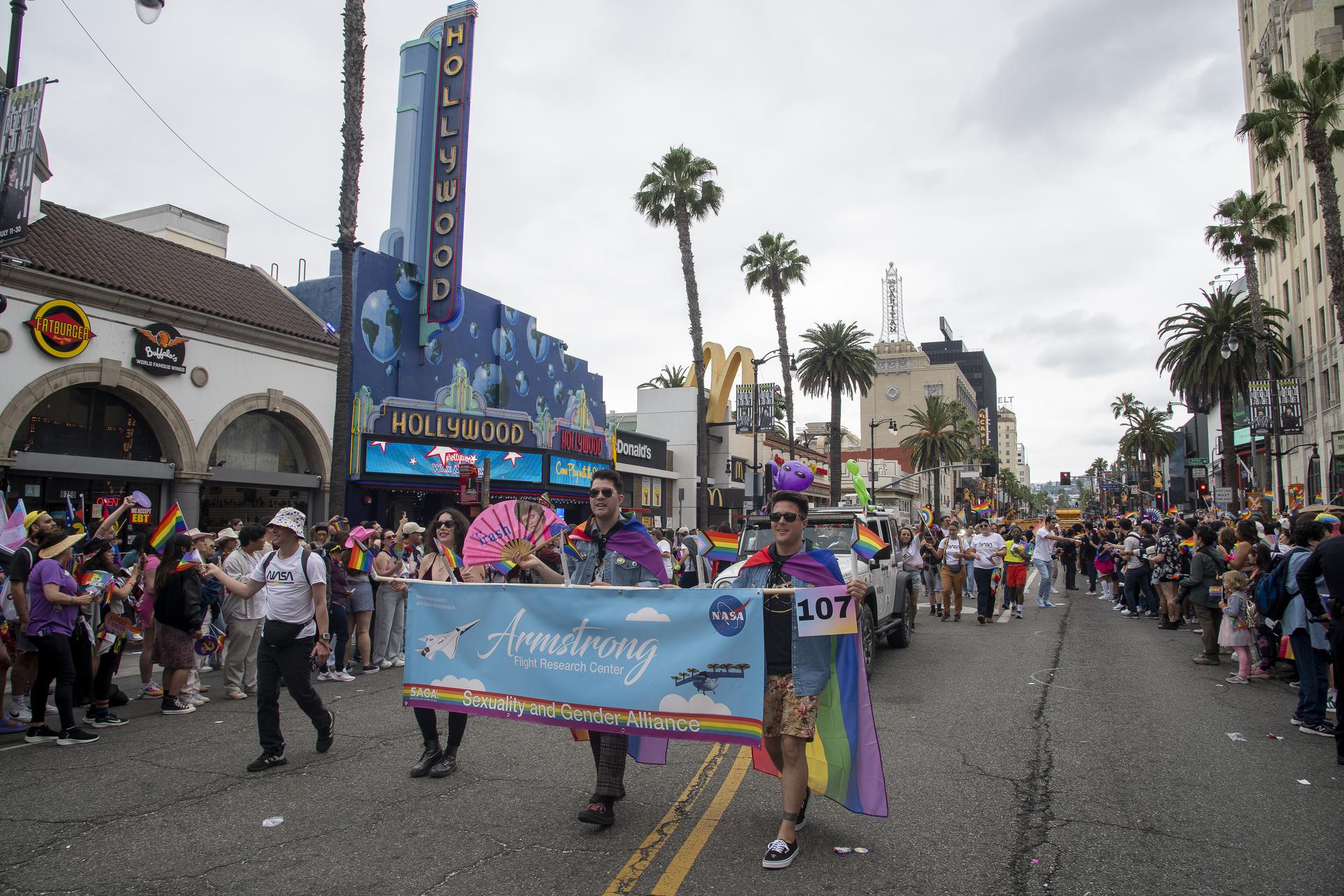 NASA’s Armstrong Flight Research Center in Edwards, California, and NASA’s Jet Propulsion Laboratory in Pasadena, California marched in the LA Pride Parade in June 2023. This was NASA Armstrong’s first time participating in the parade, and many NASA employees attended to celebrate the LGBTQIA+ community and allyship. NASA’s team included engineers, scientists, technicians, and mission support folks who enrich the organization by showing up as themselves. On Earth and at NASA, there is space for everyone.