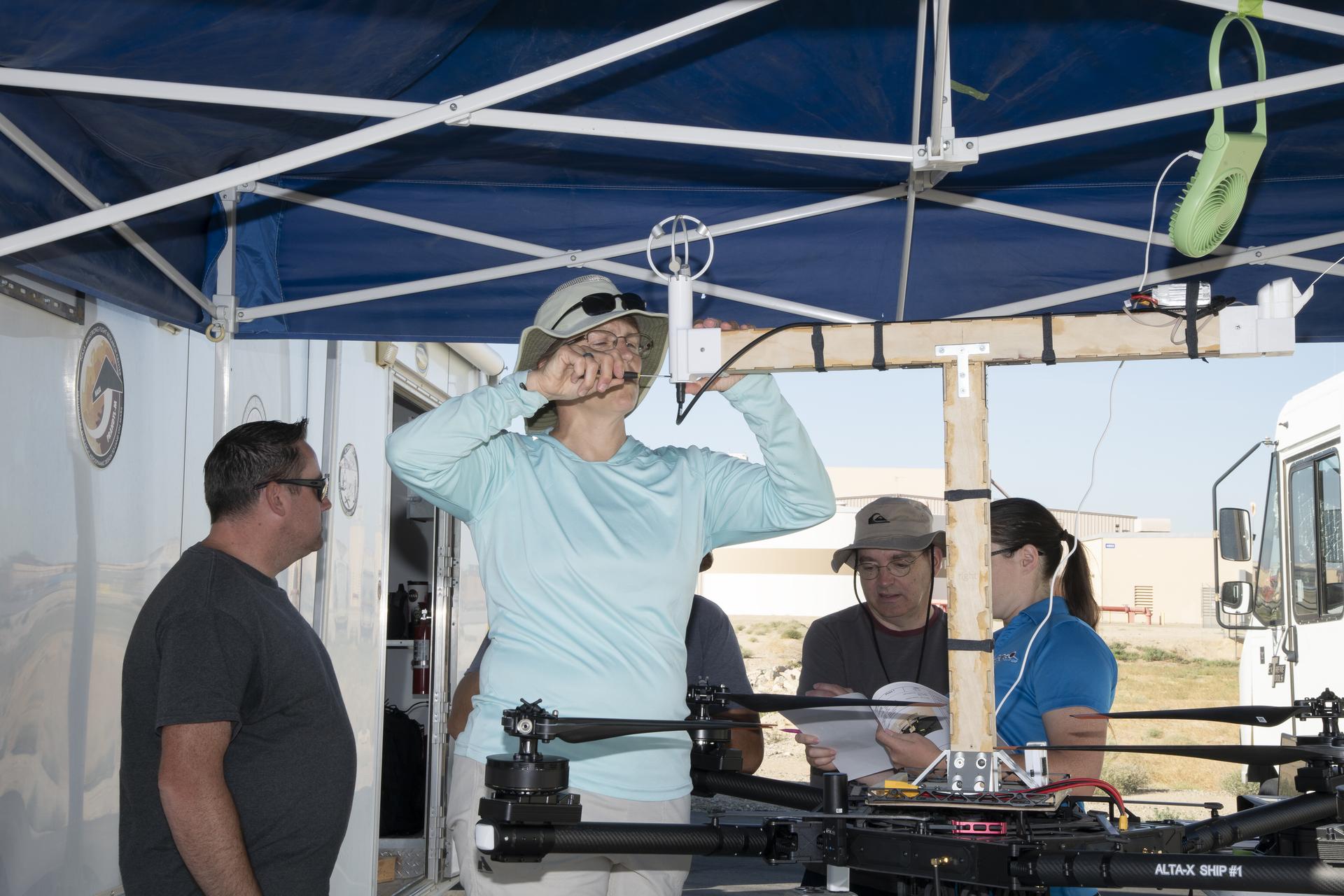 Jennifer Fowler works on securing sensors onto the test fixture on the Alta-X aircraft. Justin Link, Grady Koch, and Tyler Willhite are in the background. The Advanced Exploration of Reliable Operation at Low Altitudes: Meteorology, Simulation and Technology campaign was at NASA’s Armstrong Flight Research Center in Edwards, California. The focus was to study wind from the ground to 2,000 feet to provide data to assist future drones to safely land on rooftop hubs called vertiports and to potentially improve weather prediction.
