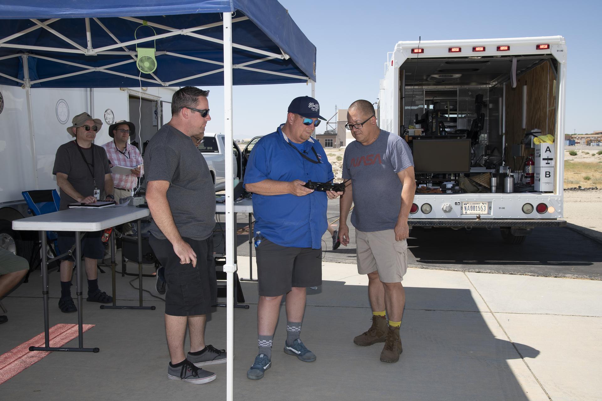 Justin Link, left, Red Jensen and Derek Abramson prepare for an Alta-X aircraft flight as part of the Advanced Exploration of Reliable Operation at Low Altitudes: Meteorology, Simulation and Technology campaign. In the background are Grady Koch and Jennifer Fowler. The campaign was at NASA Armstrong to study wind from the ground to 2,000 feet to provide data to assist future drones to safely land on rooftop hubs called vertiports and to potentially improve weather prediction.