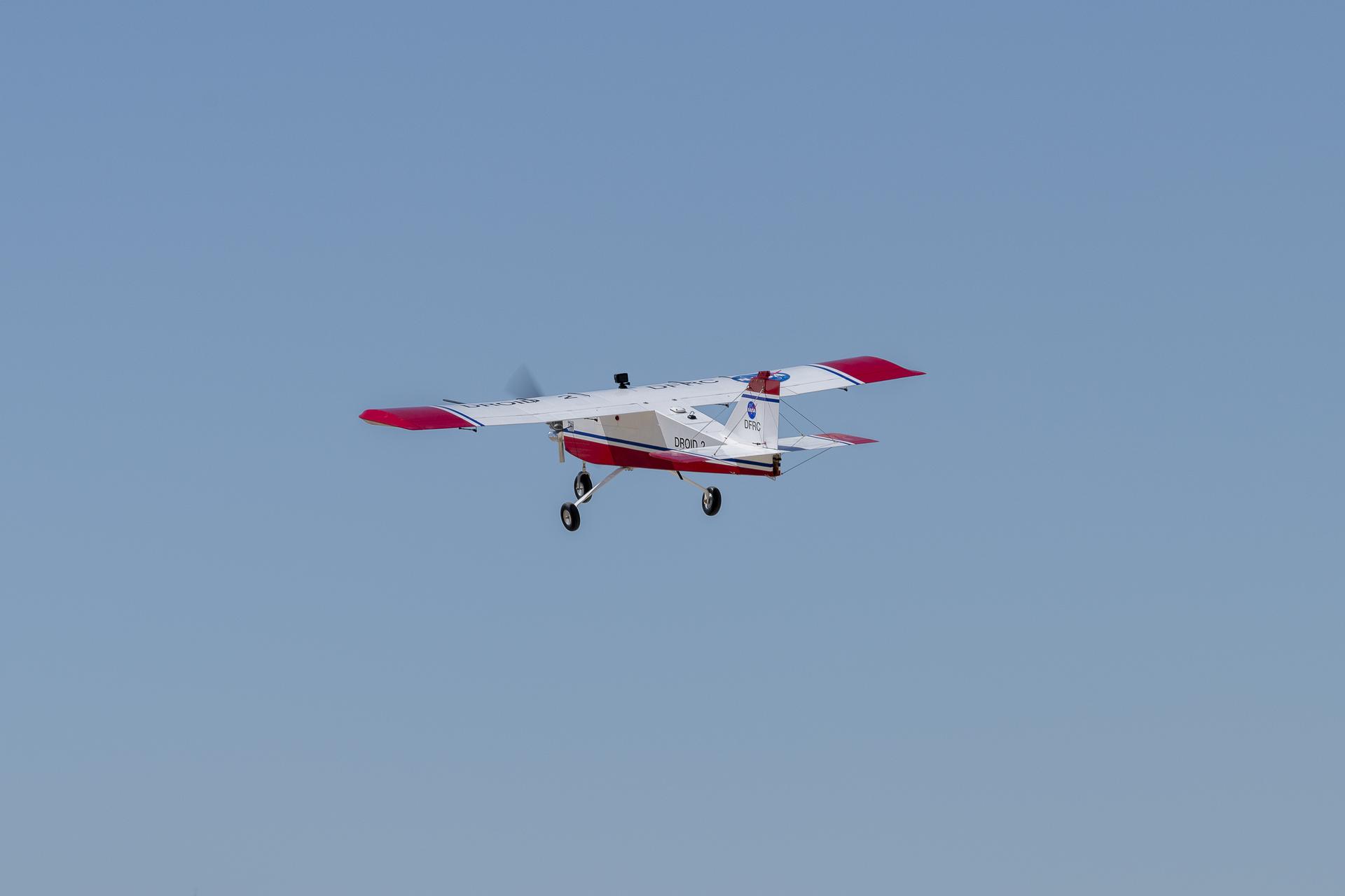 The DROID 2 (Dryden Remotely Operated Integrated Drone 2) flies at NASA's Armstrong Flight Research Center in Edwards, California, as part of the Advanced Exploration of Reliable Operation at Low Altitudes: Meteorology, Simulation, and Technology campaign. The focus was to study wind to provide data for safe takeoff and landing of future air taxis.